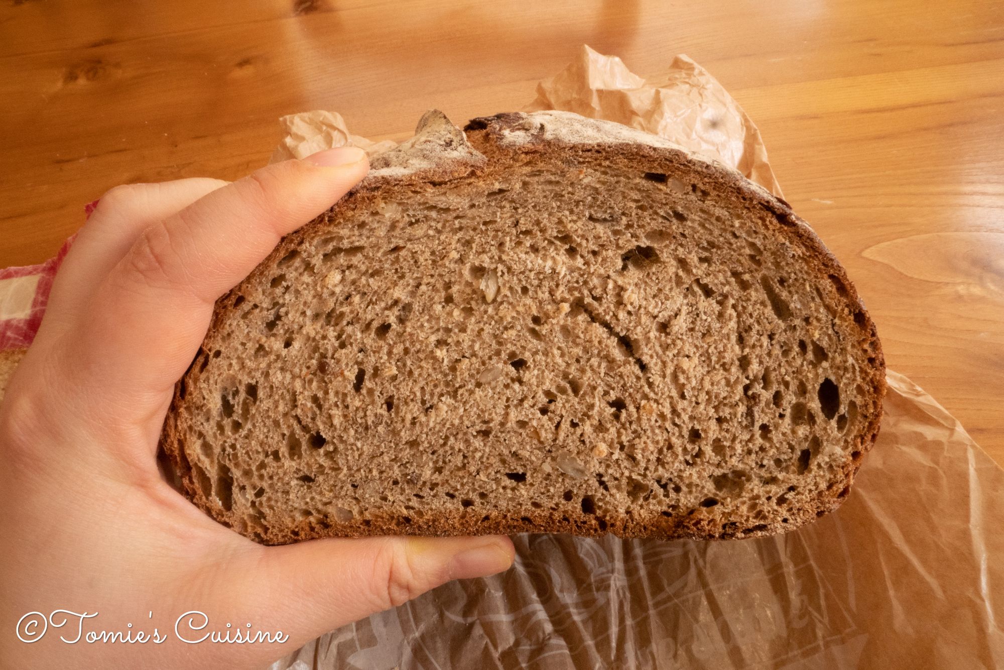 The red one is a beeswax wrap that we bought three years ago from a local shop. (No one used it until today, I found it in the cupboard, but it still works!) There is almost no bread left, but it’s still soft like a day after the purchase. On the other hand, the one in the paper bag is hard. I couldn’t even squeeze it. So I wrapped it in another beeswax wrap and left it overnight.