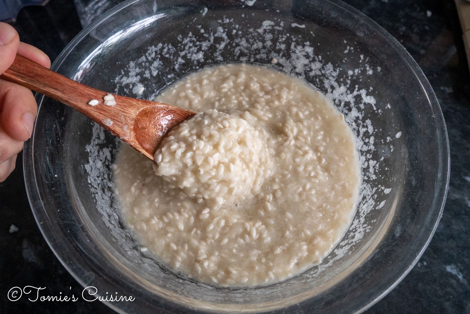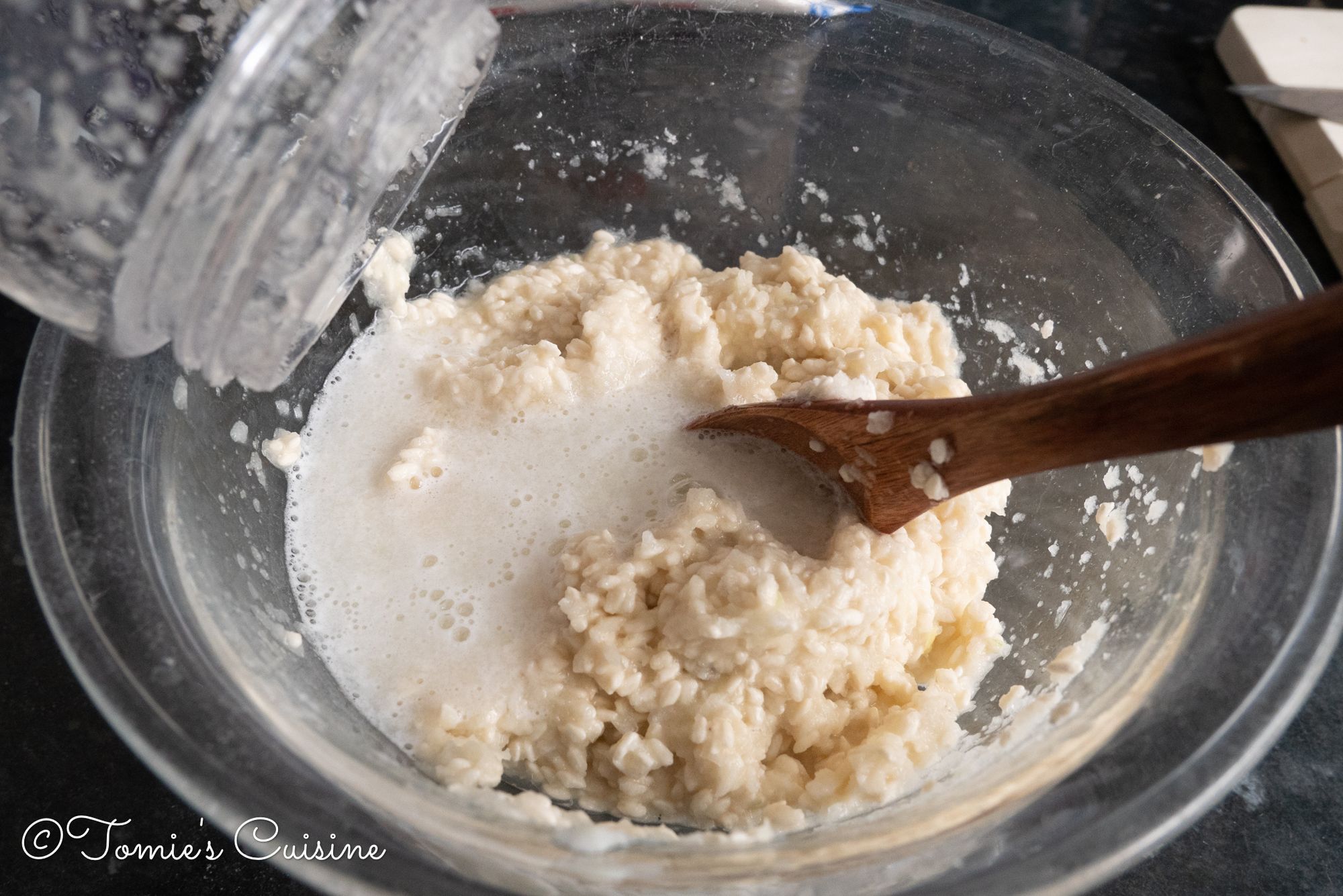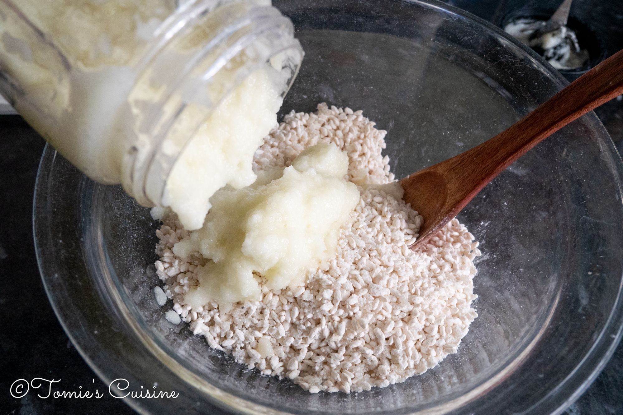 - Add blended onion into the bowl and mix well. Add water little by little if necessary. (Depending on the water content of the onion. I added about 150ml of water to make this consistent in the photo.)