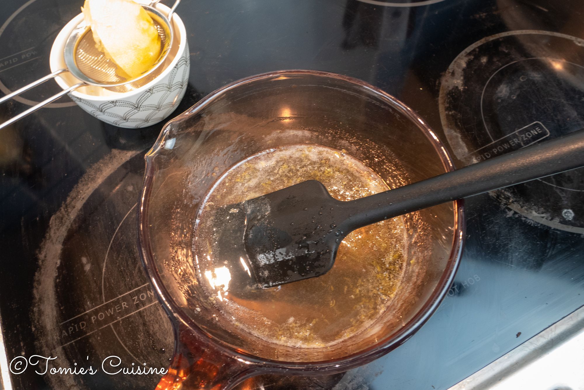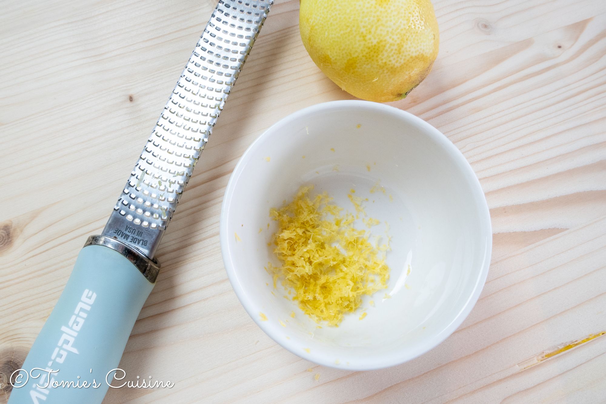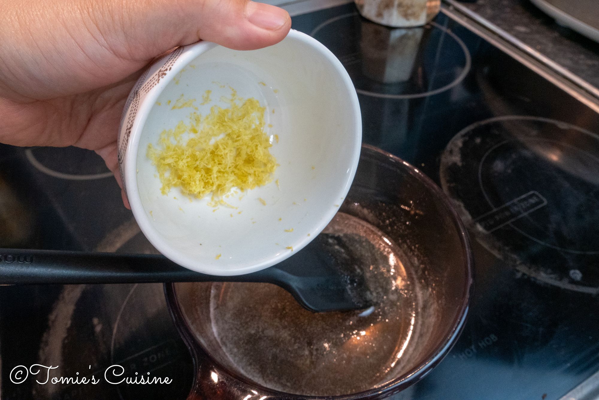 - Turn off the heat, and let it cool for a minute. Add half a lemon’s worth of zest and juice and mix well.
