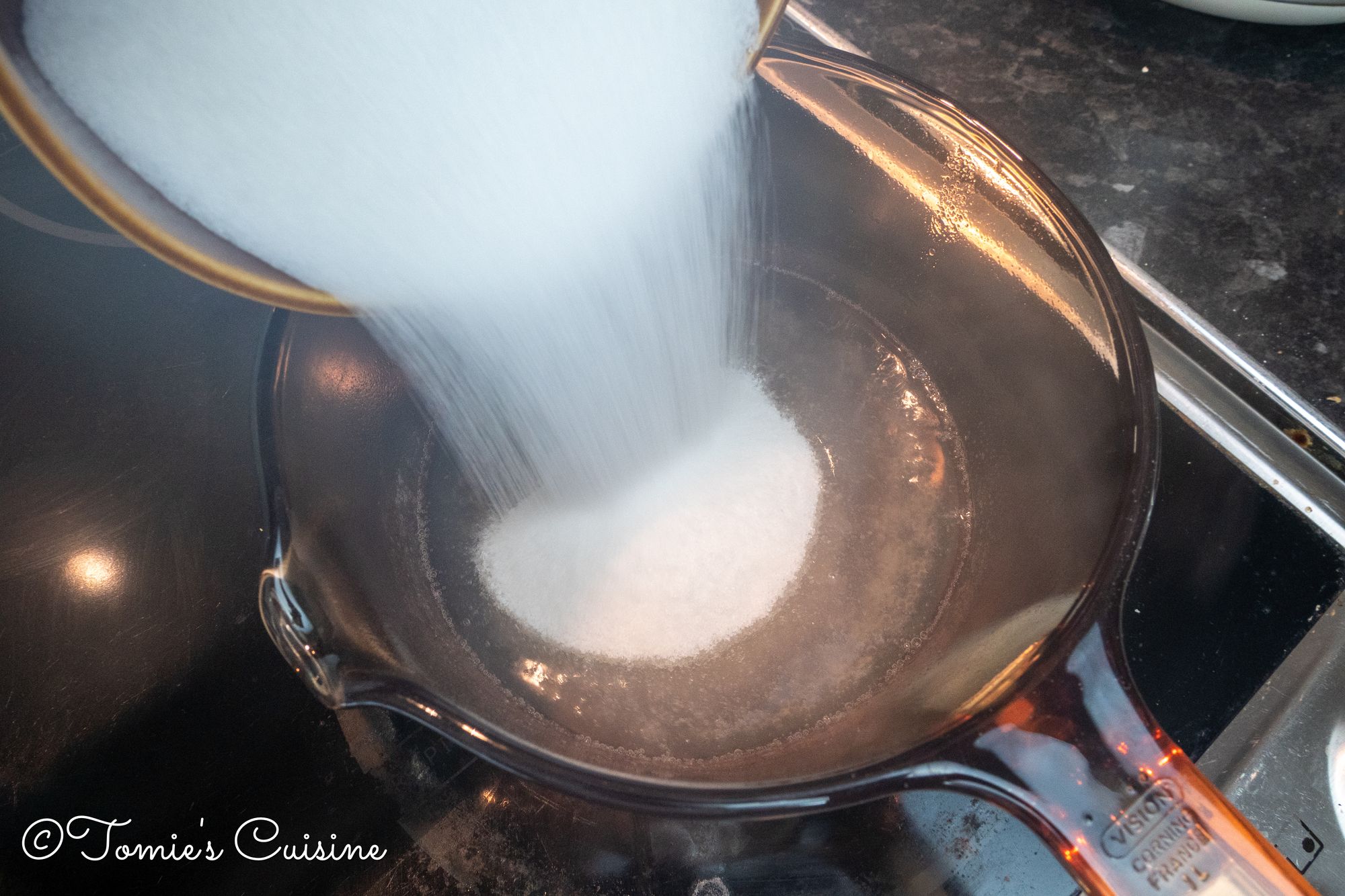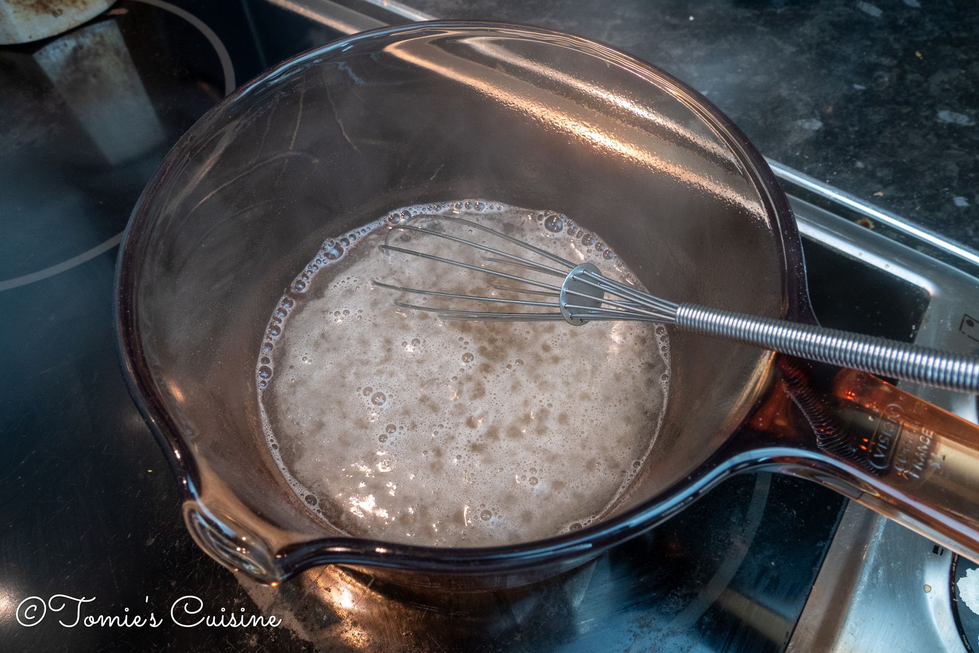 - Add the sugar and stir well until you see the liquid make a string kind of texture. (the mixture is very hot! Be careful when you are handling it.)