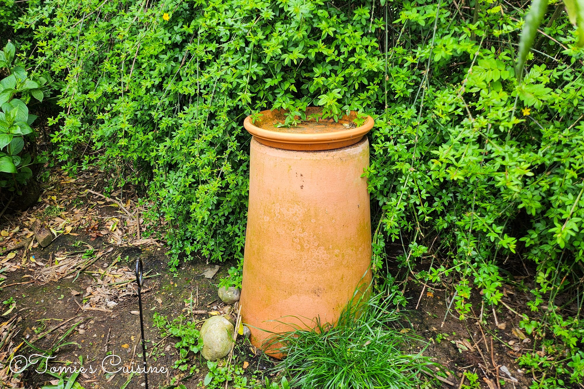 The bacteria in the soil will break down the waste, and the plants around it will use it as fertiliser. Unlike the plastic compost bin, the terracotta pot allows some air to pass through, further reducing the smell.
