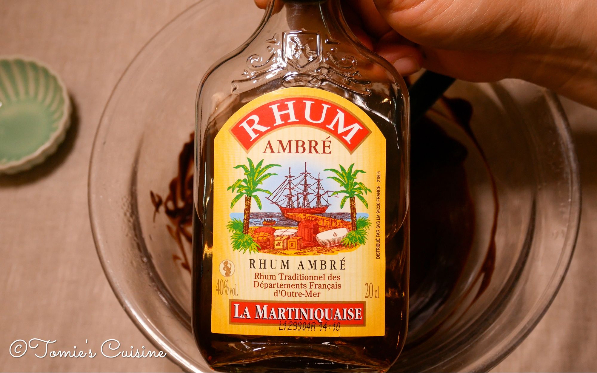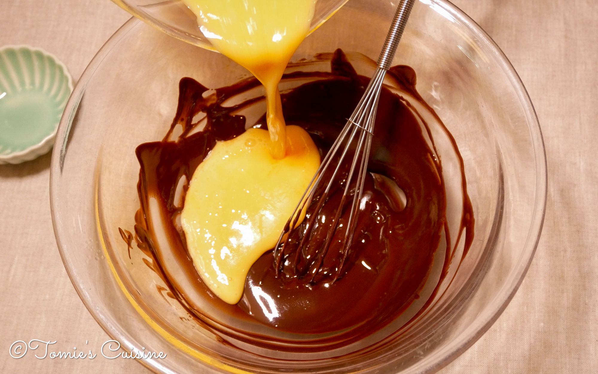 1. Pour the eggs into the melted chocolate mixture and mix well with a whisk. Add rum if you like it at this point.