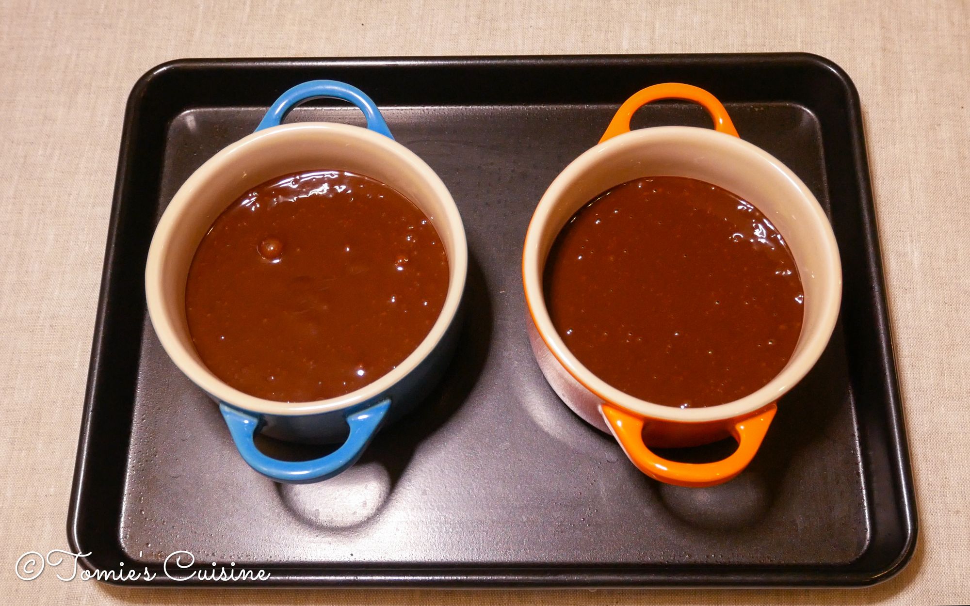 1. Pour the mixture into the ramekins and place them on a baking tray.