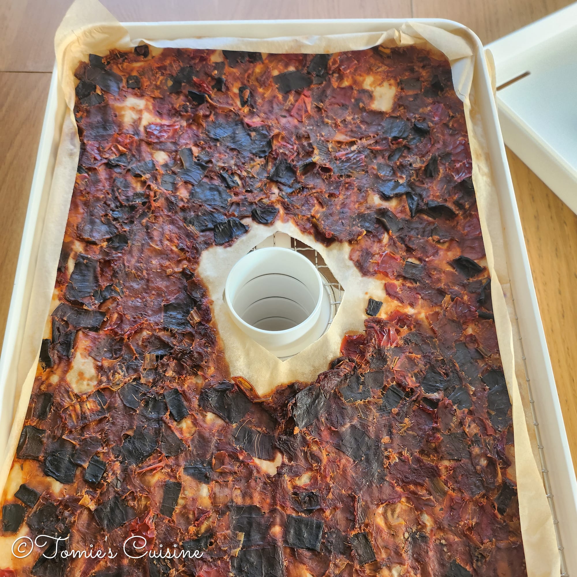 - Spread evenly on the food dehydrator with a cooking sheet, set the temperature at 65C, and dry it for 10 hours or until it dries completely.