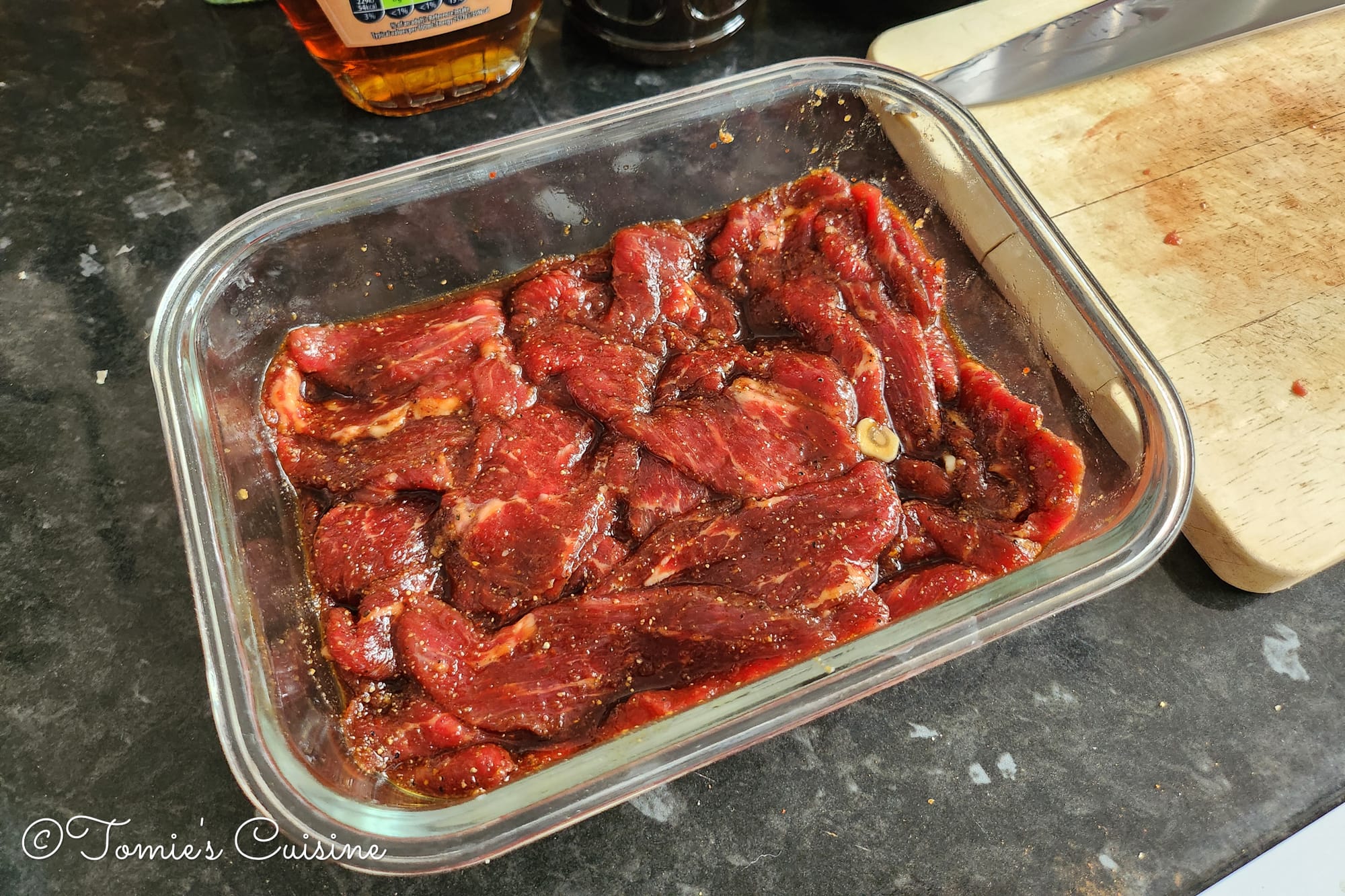 - Slice the beef. Add it to the marinade and refrigerate for at least two hours, preferably overnight.