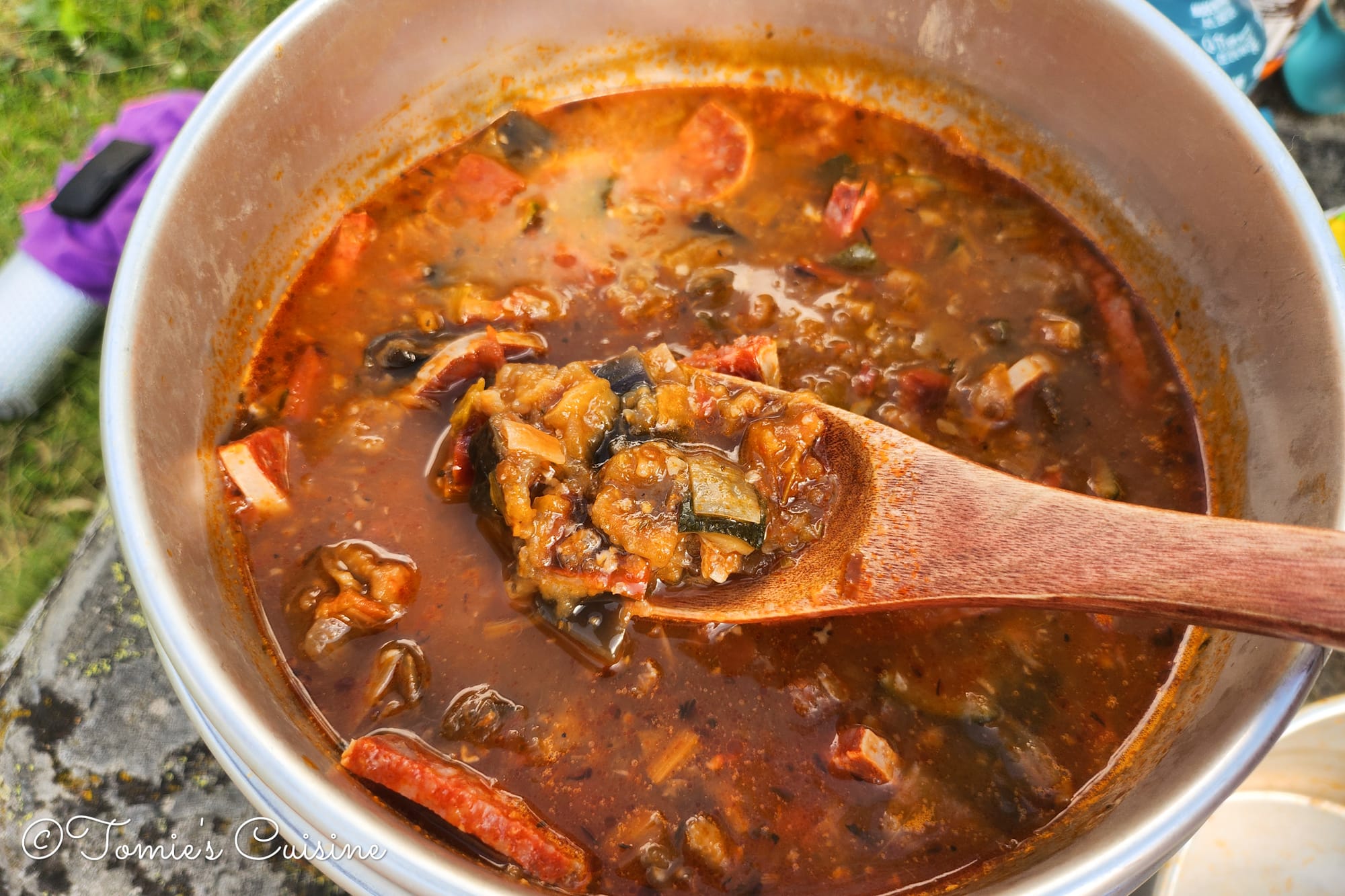 In the Pyrénées, we found a local butcher selling delicious chorizo. We bought one and added it to the ratatouille. It was delicious.