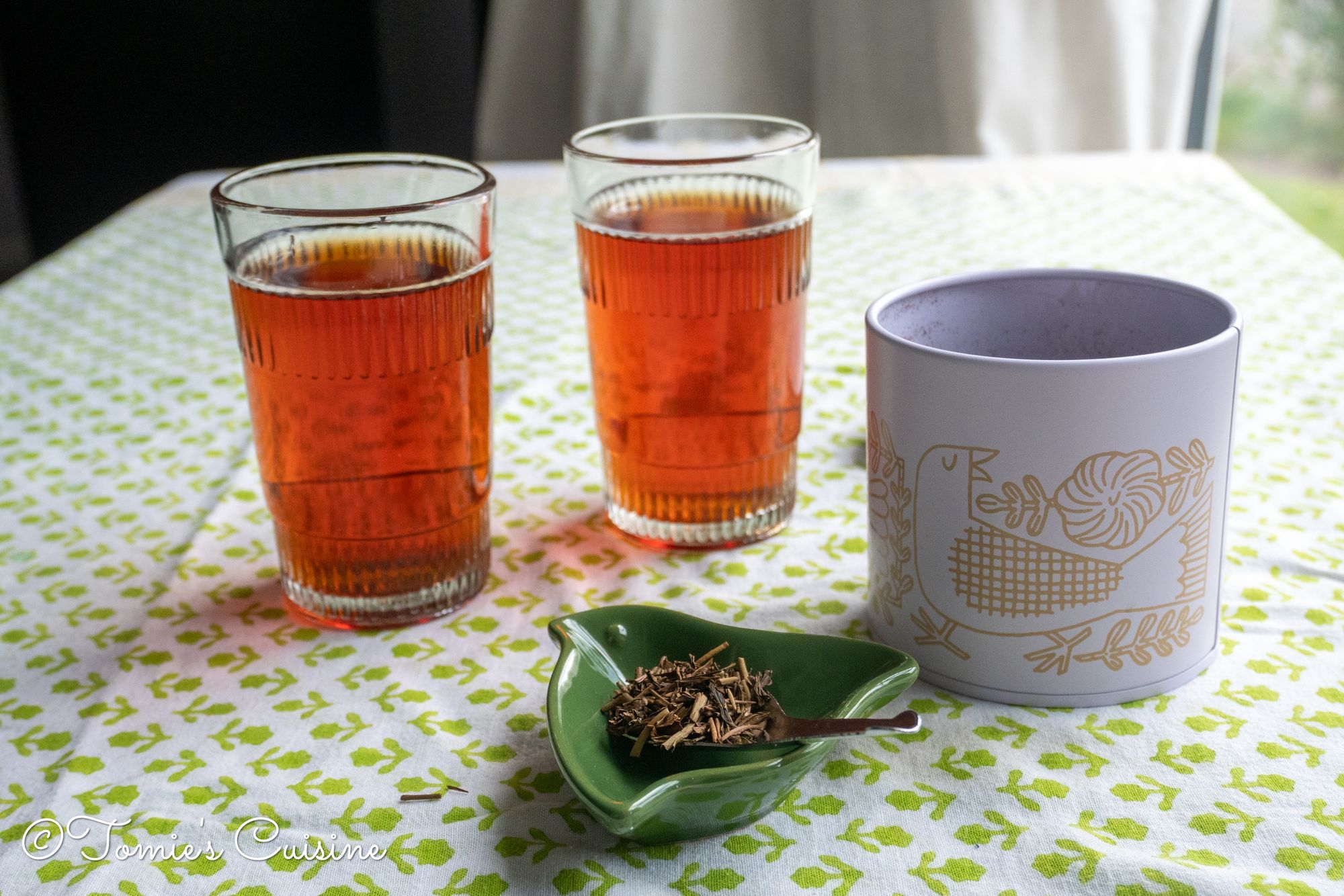 After eating, we have hot drinks for lunch — mostly coffee. For dinner, we drink various teas, such as Japanese green tea, hojicha (roasted green tea), mint tea, rooibos, and some herb teas. We choose whatever we feel like that evening. The only hard rule is when we wake up early the next day, we avoid tea that contains caffeine.