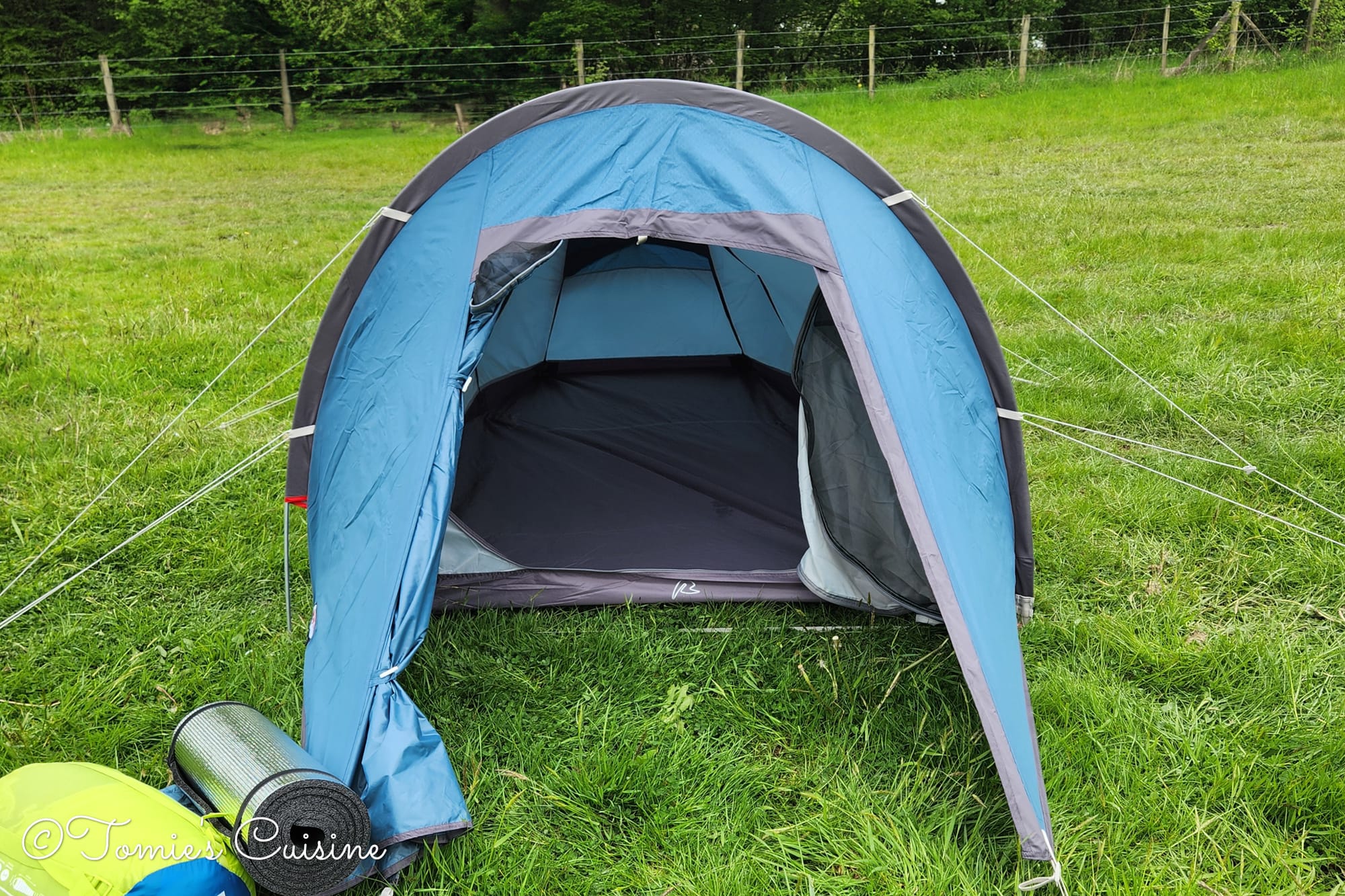 Before taking it out, we tested it while camping in the UK during heavy rain, and we didn’t get any water leaking through the tent; even the bottom sheet was dry. This poor weather was an excellent opportunity to try and cook within the limited porch space, which, since you can open the door from the top, means it’s possible. We tied a poncho during the hike to extend it, as seen in the photo above.