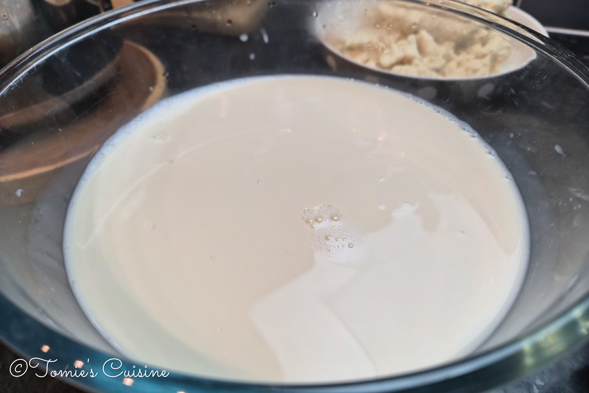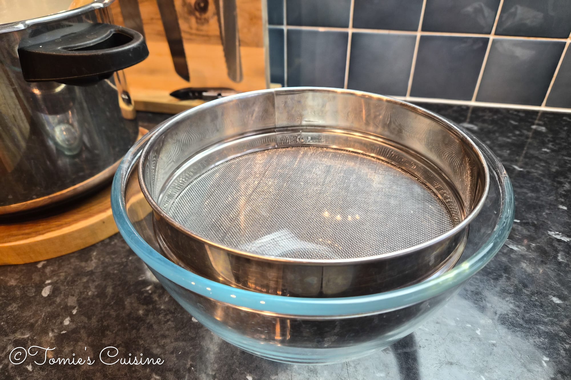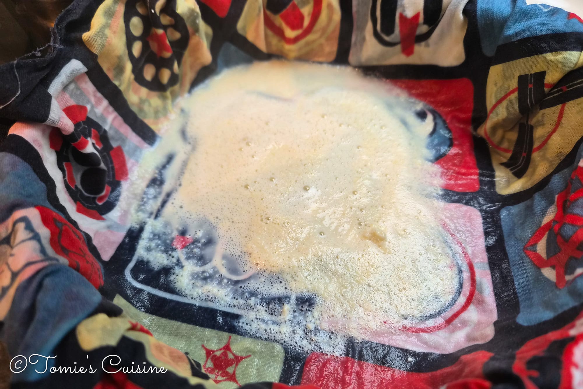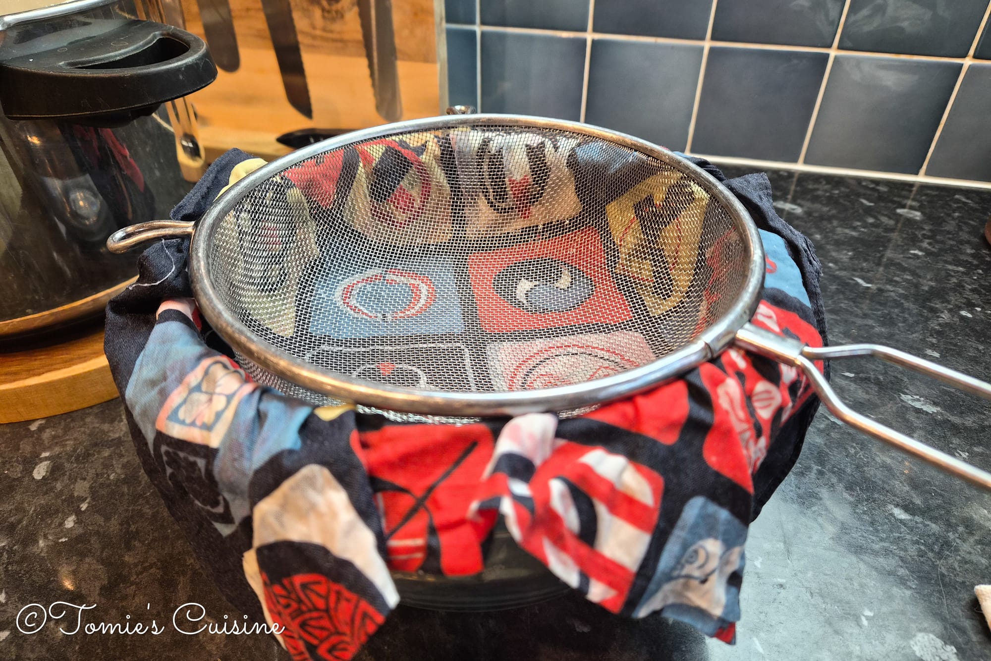 To squeeze the soya milk, I use a large bowl, two sieves, and a tea towel. This method makes the process easier because fresh soya milk can be extremely hot.