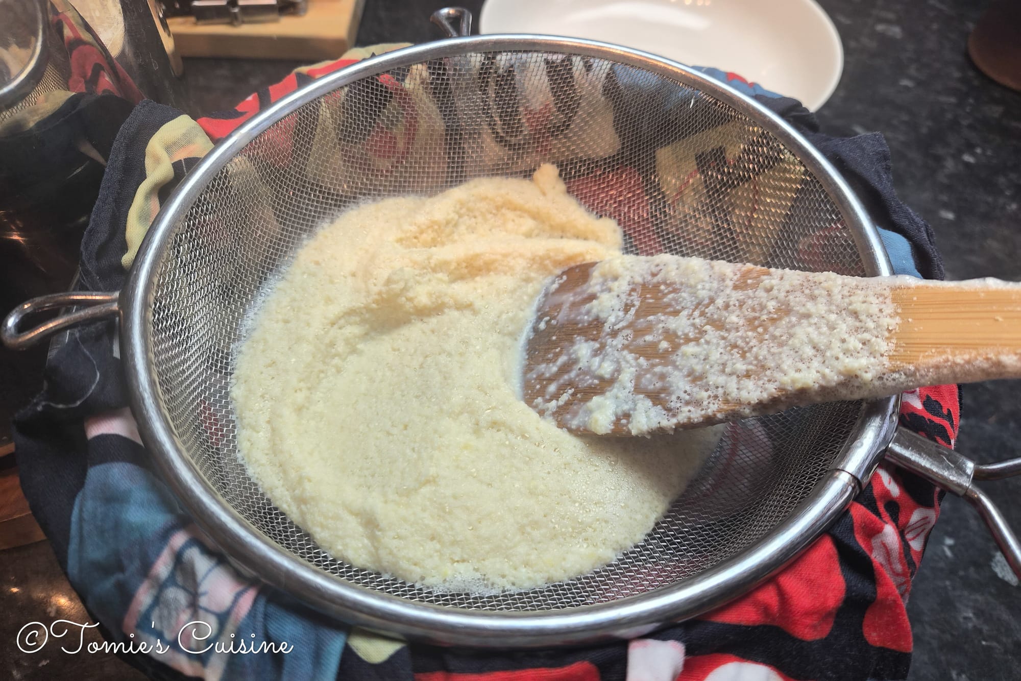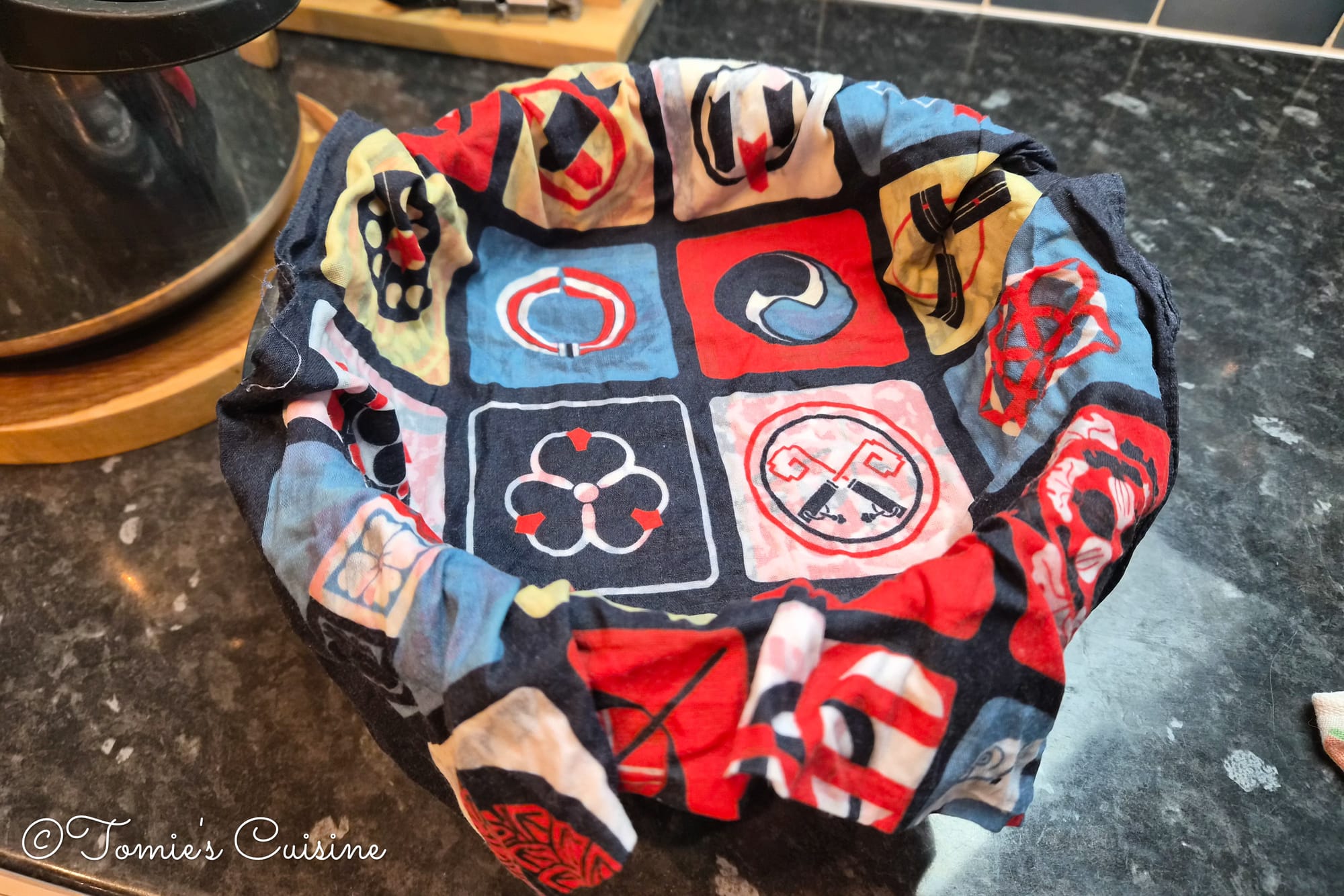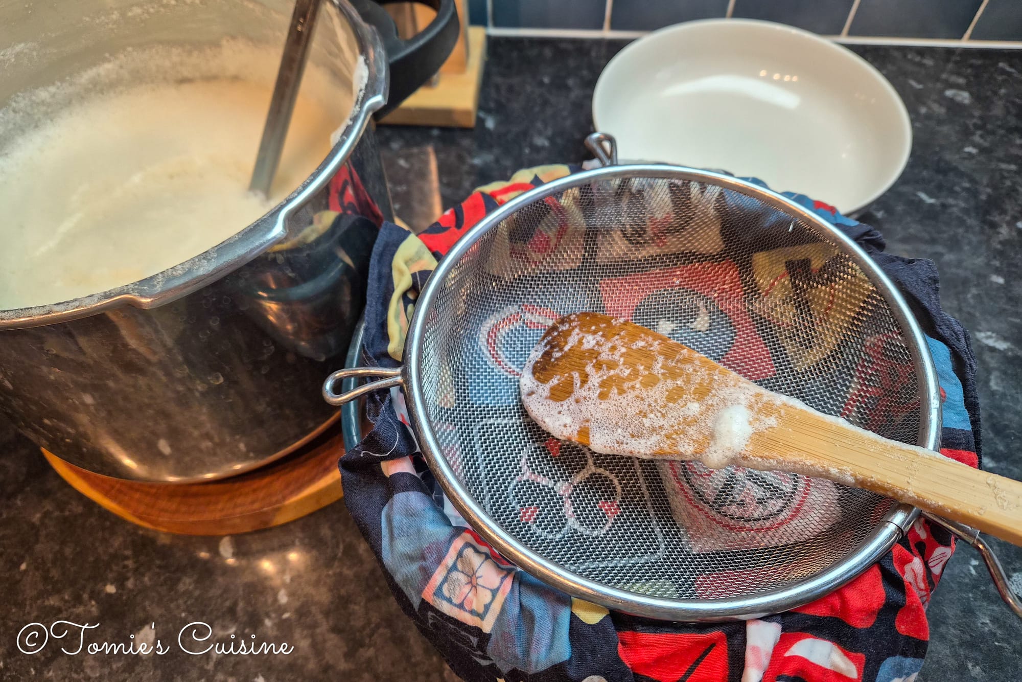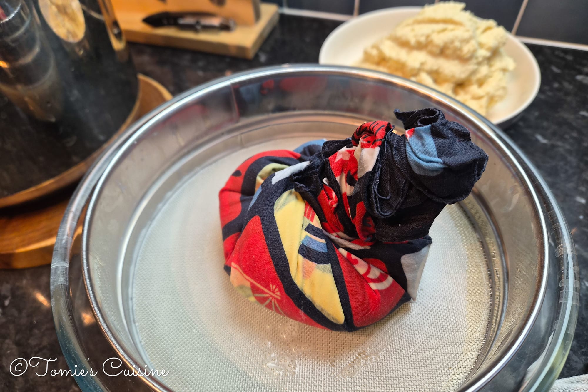 To squeeze the soya milk, I use a large bowl, two sieves, and a tea towel. This method makes the process easier because fresh soya milk can be extremely hot.