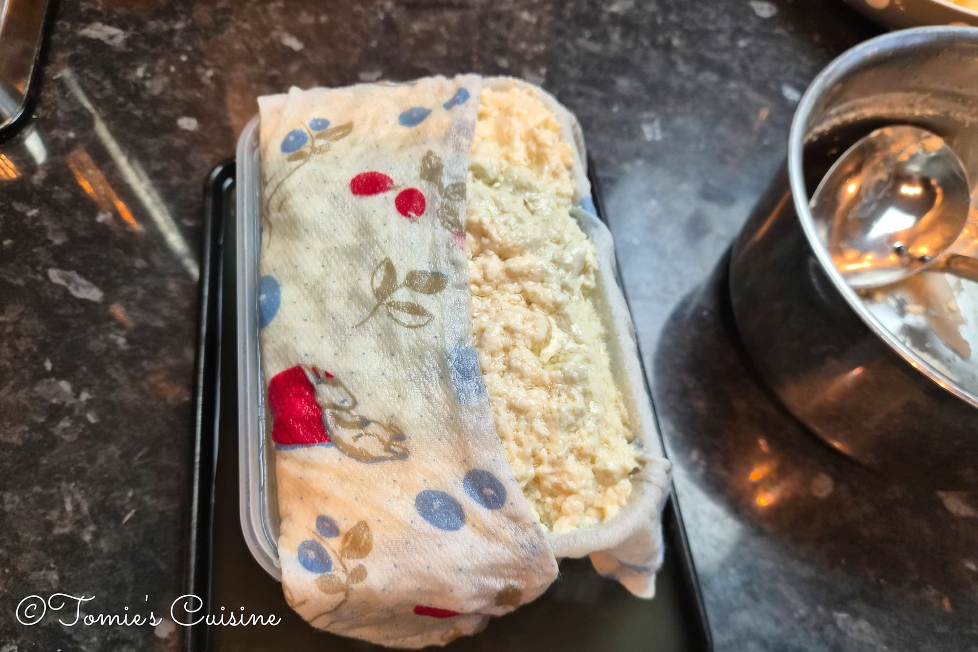 - Using a ladle, gently scoop the set tofu into the mould, distributing it evenly. Try not to break it up too much, and keep your movements slow and deliberate.