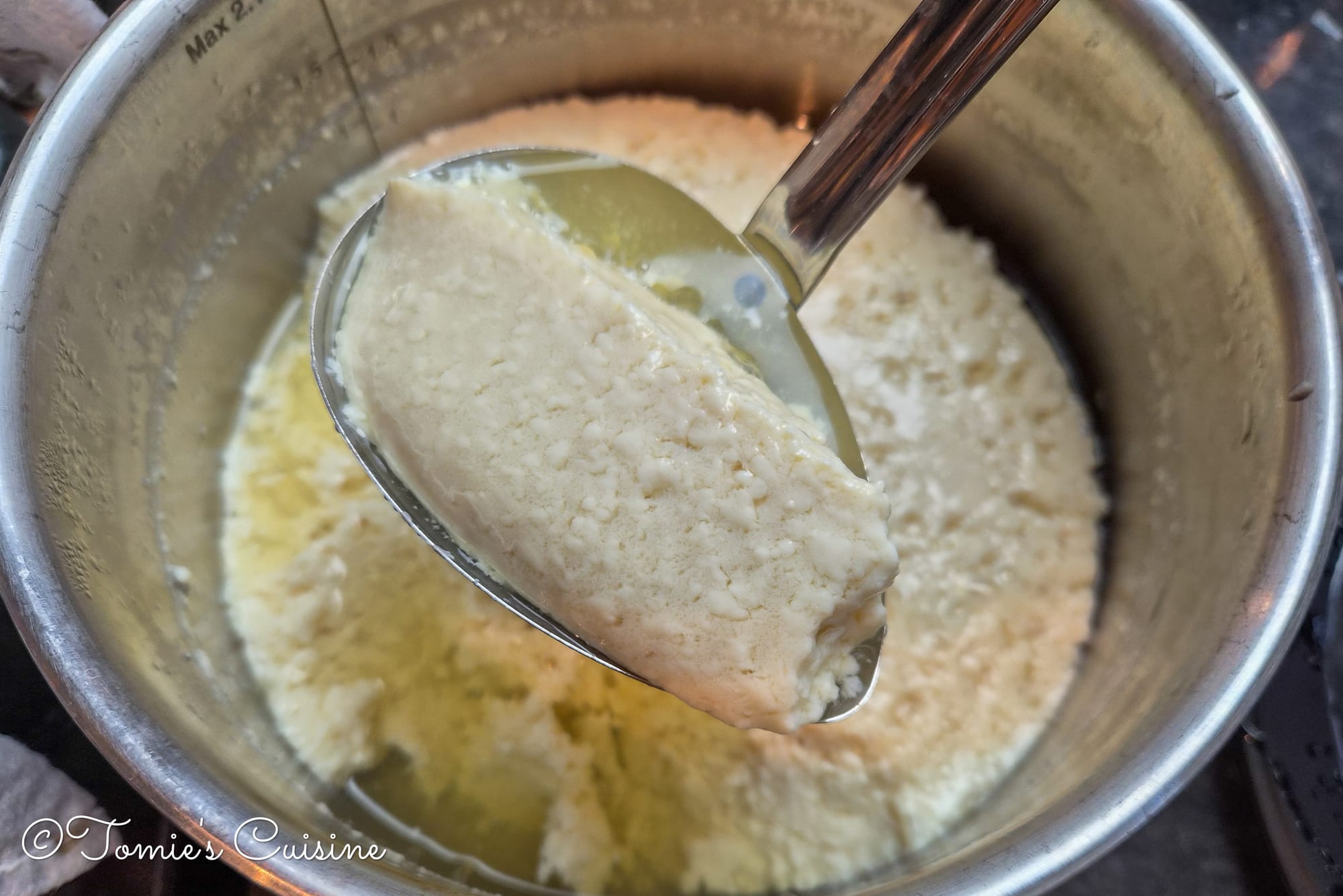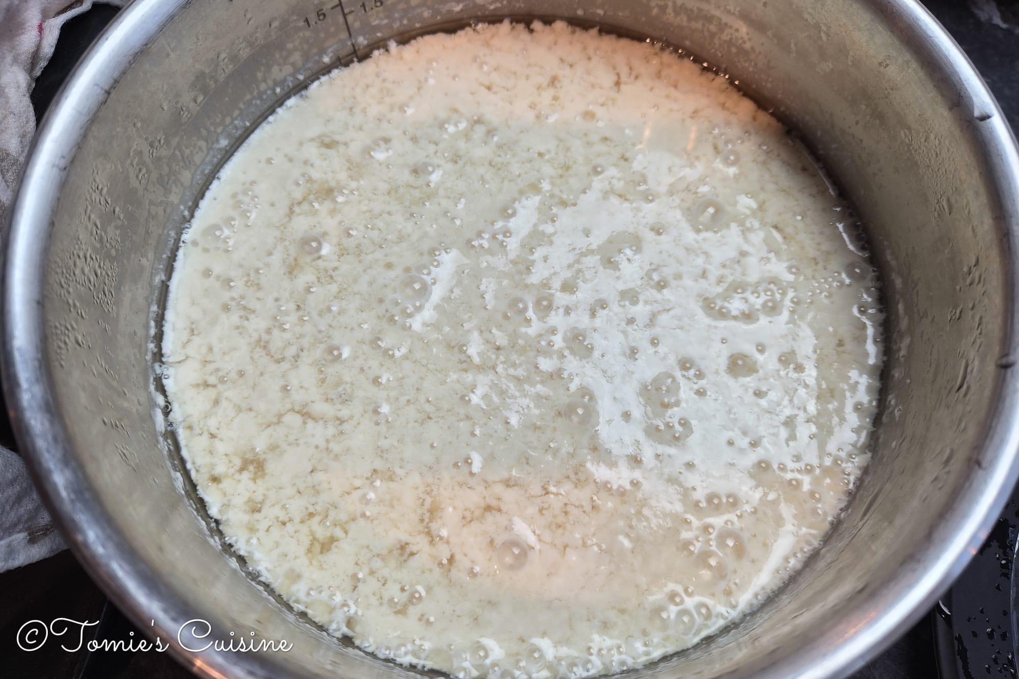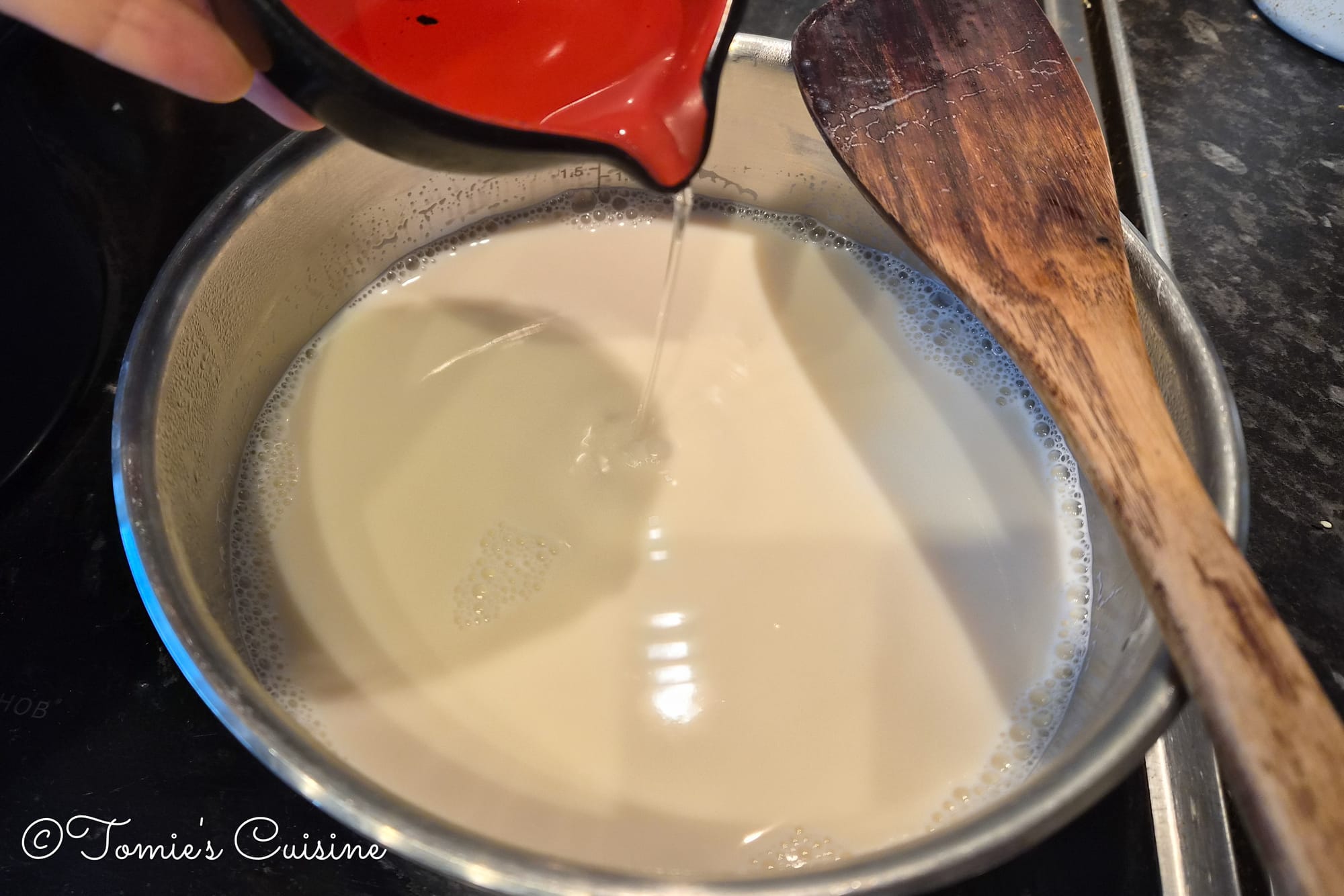 - Pour the soya milk into a saucepan and heat over medium, scraping the bottom with a spatula as needed to prevent burning.