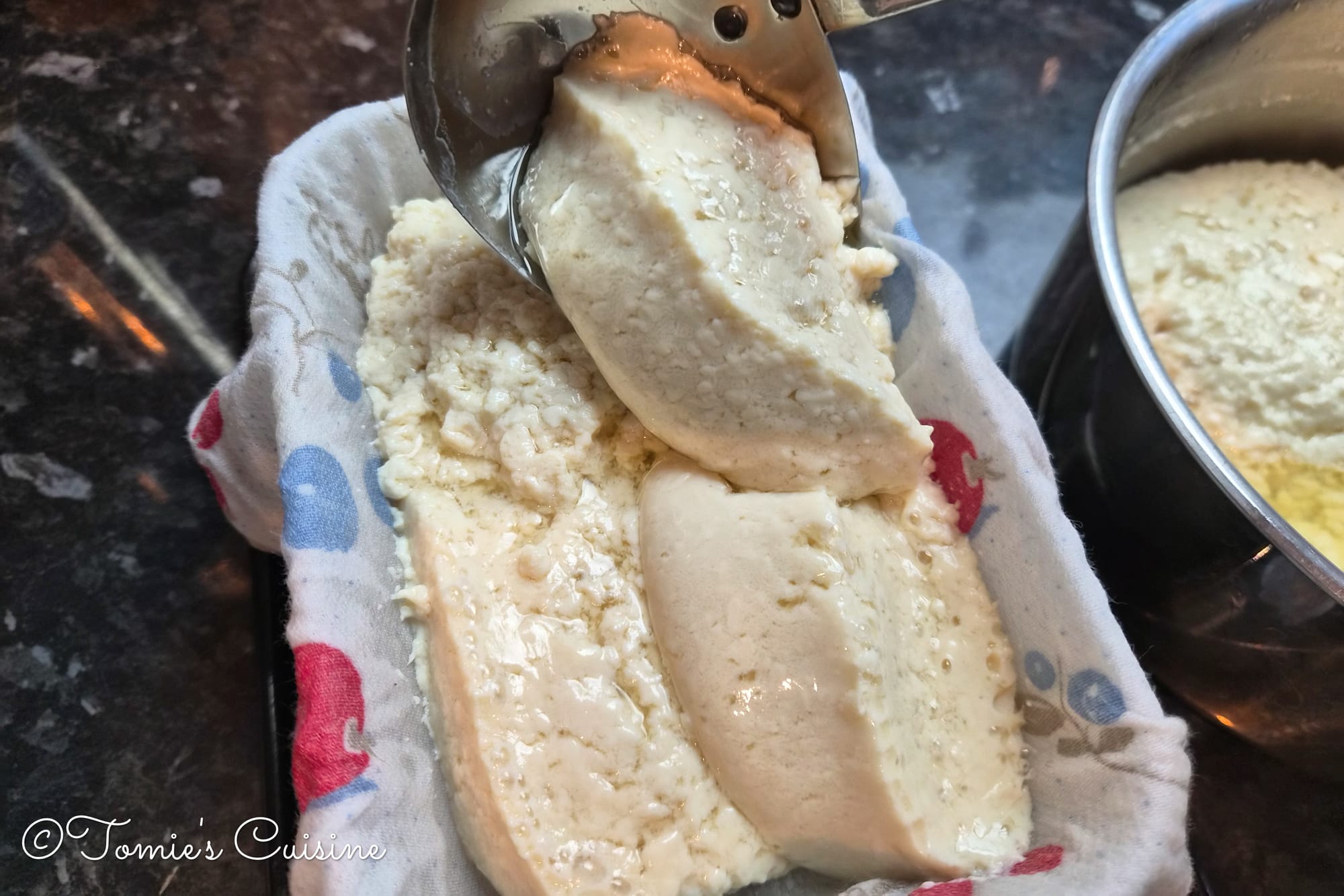 - Using a ladle, gently scoop the set tofu into the mould, distributing it evenly. Try not to break it up too much, and keep your movements slow and deliberate.