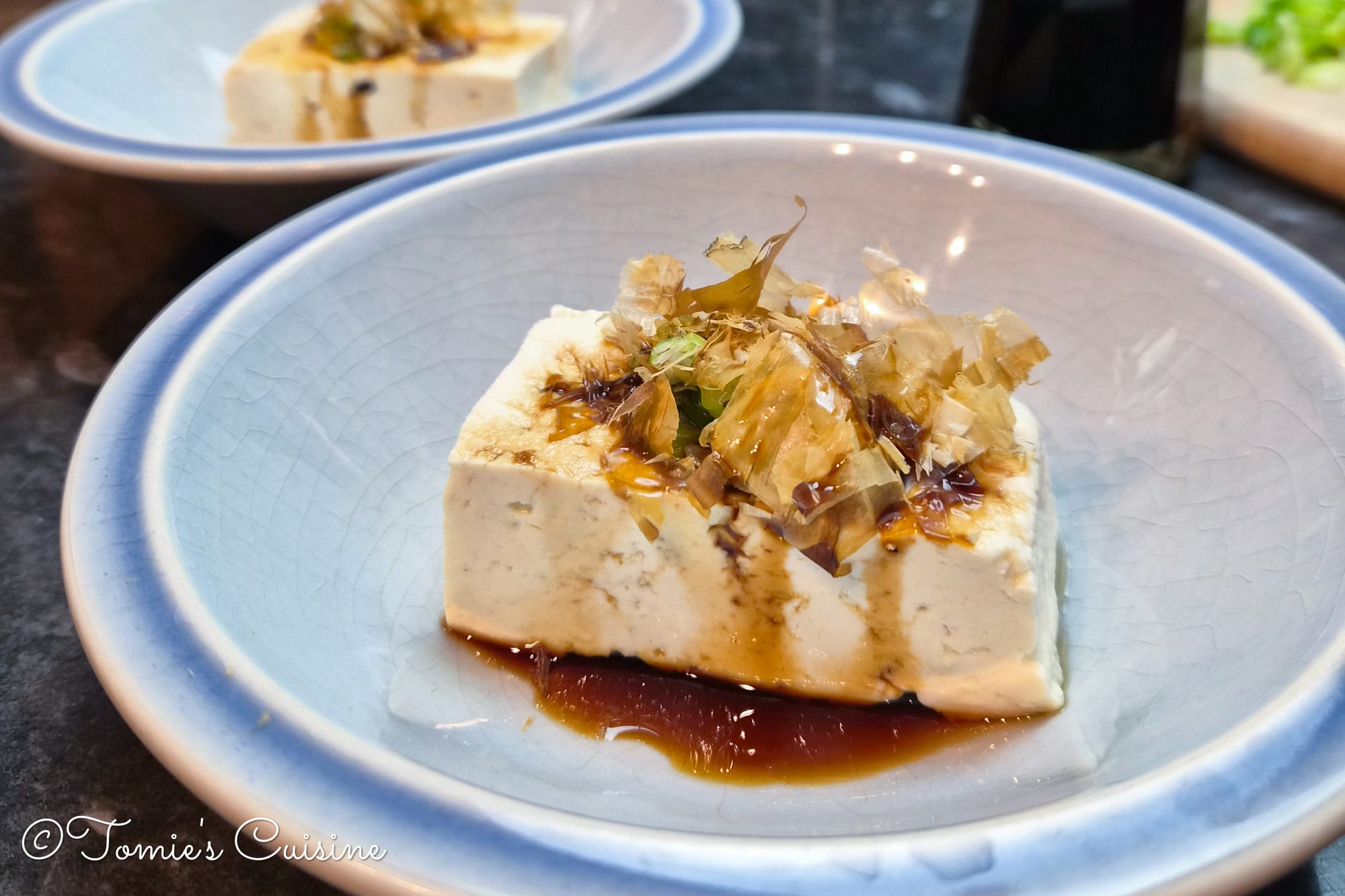 This is what I always order at an izakaya when we're in Japan. The tofu is lightly coated in corn flour or potato starch and deep-fried until crispy, then served in a savoury dashi-based broth with grated mooli, spring onion, grated ginger, and katsuobushi. Some pieces stay crunchy, some soak up the broth and go soft; it's the contrast that makes it so good. We'll share our recipe for this soon!