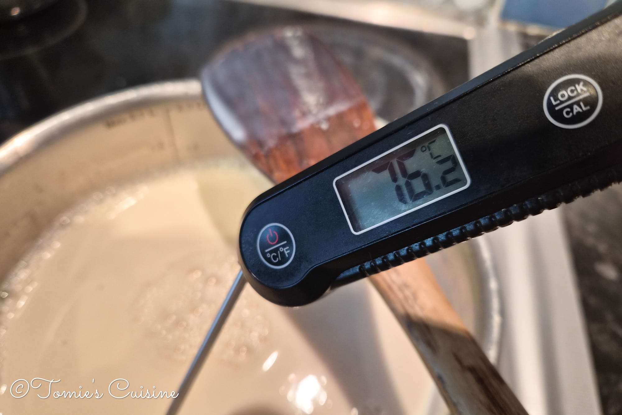 - Check the temperature with a cooking thermometer. Once it reaches 75-80˚C, turn off the heat. Pour the Epsom salt solution evenly over the surface of the hot soya milk. Stir gently two or three times, just a few slow strokes to distribute it. Then put the lid on and leave undisturbed for 20 minutes to allow the tofu to set.