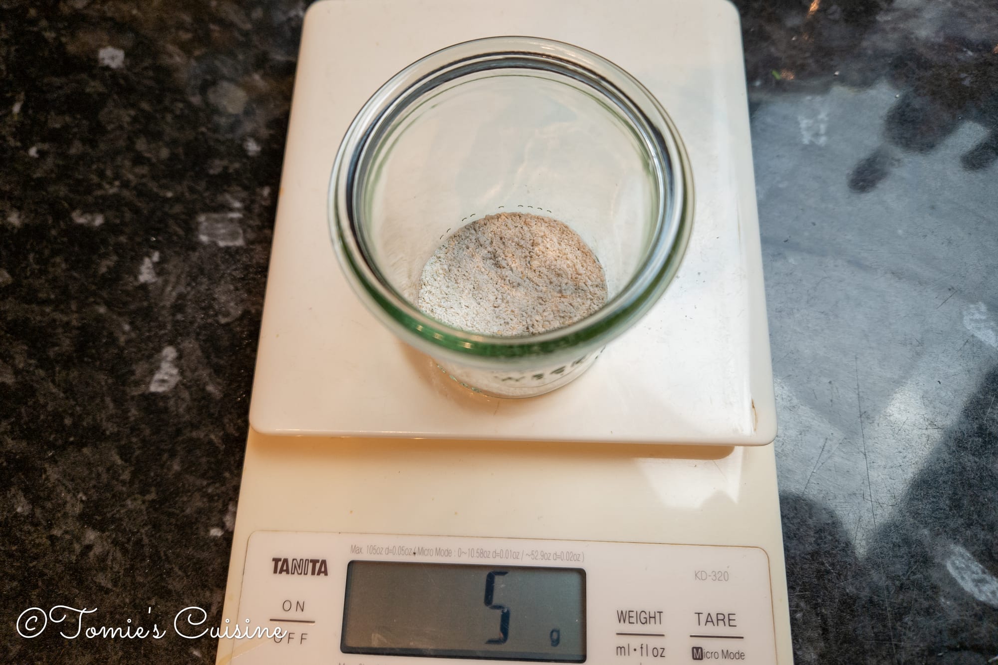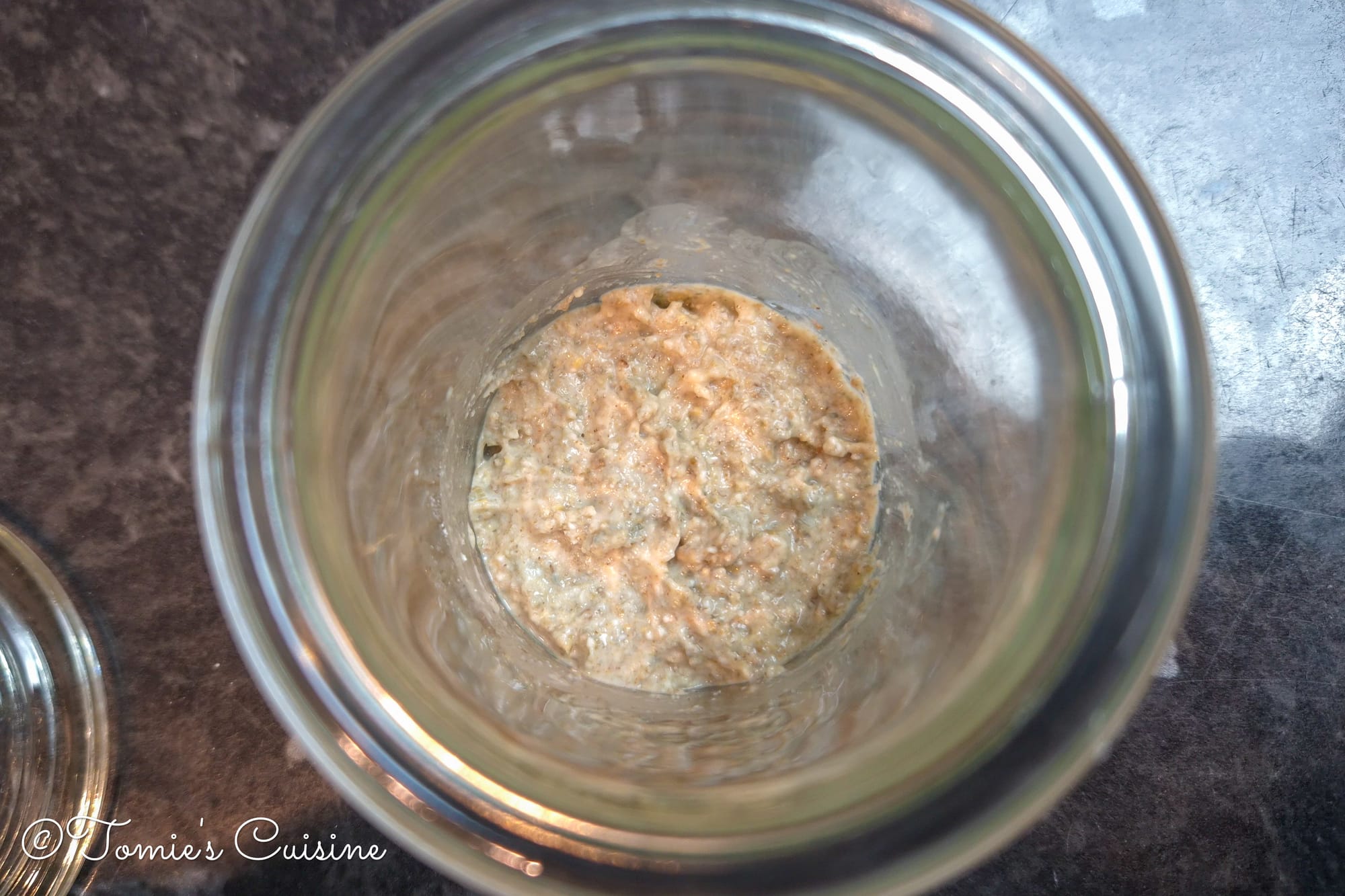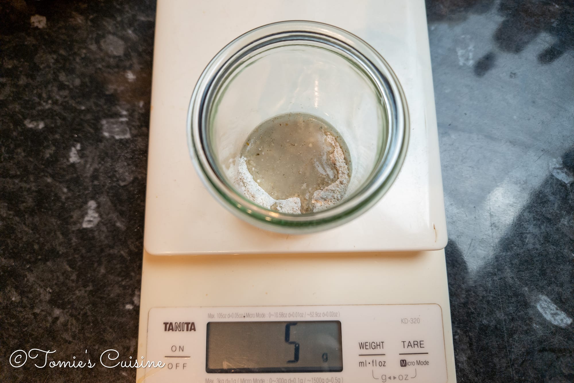 Add 5g of rye flour and 5g of water into a small, clean jar and mix well. Cover loosely and do not seal it airtight, as it needs to breathe. Leave for 24 hours.