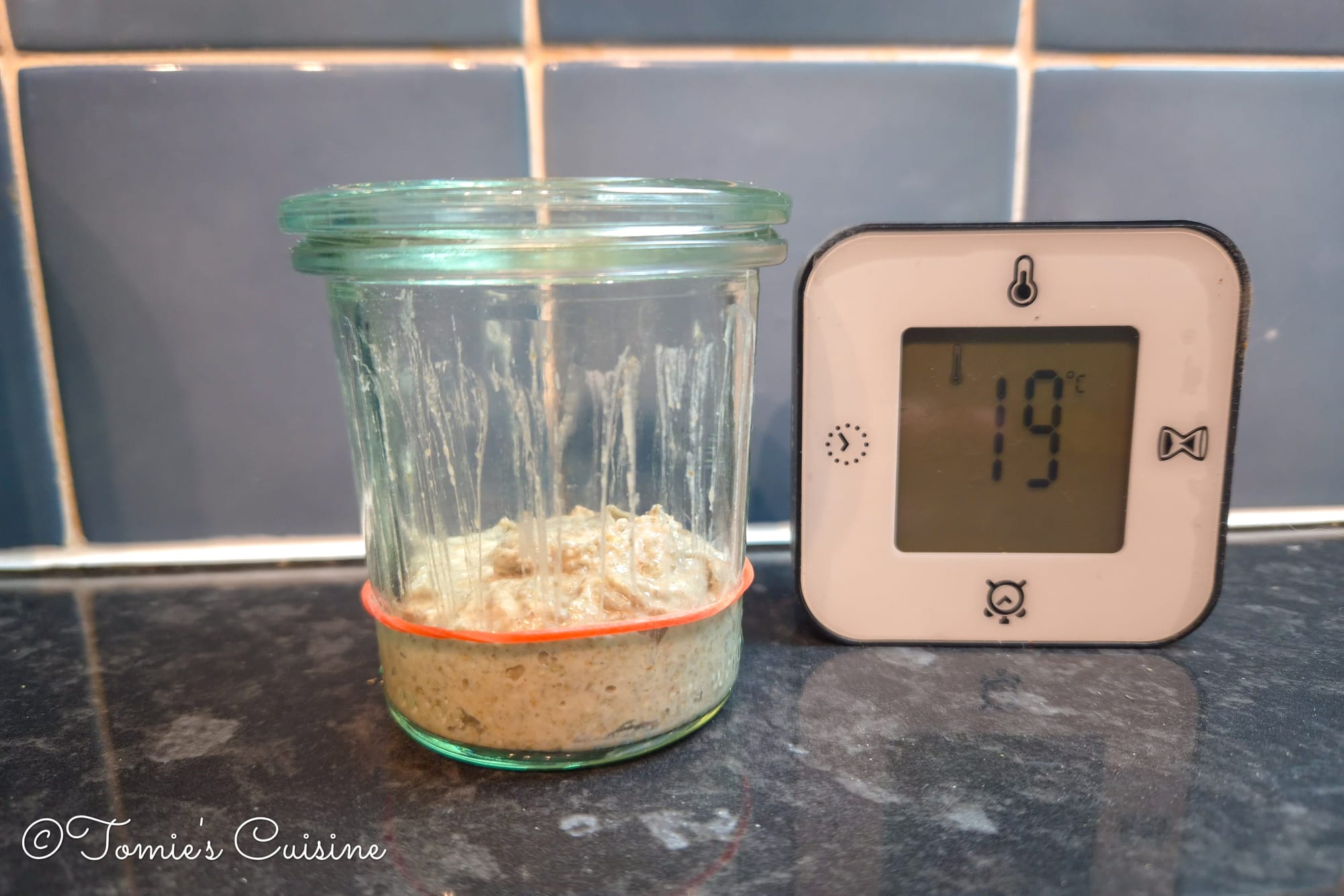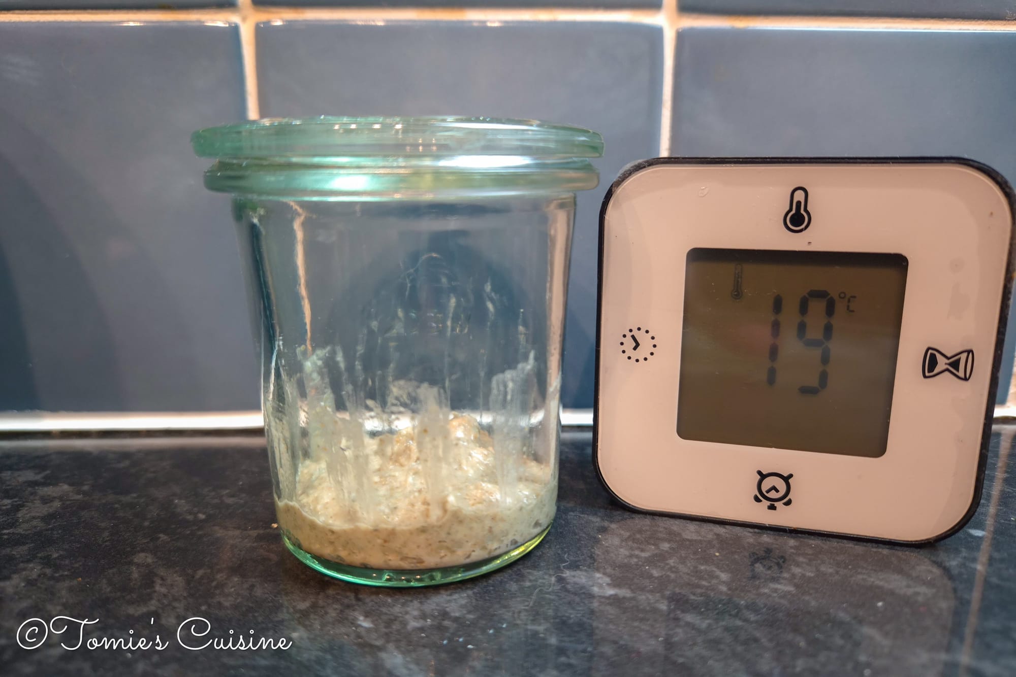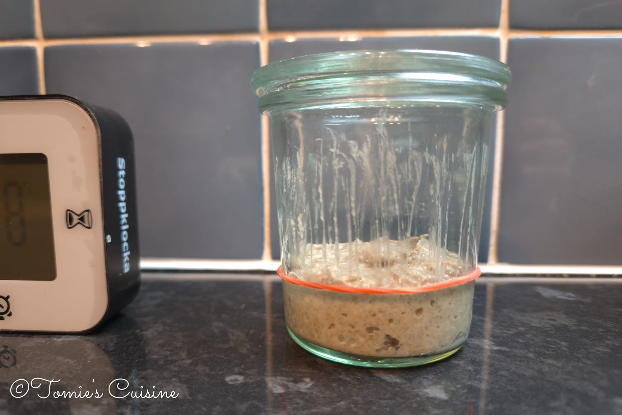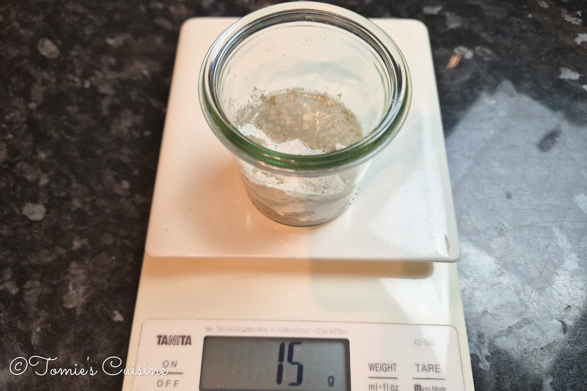 - Finally, add 15g of rye flour and 15g of water to your clean container. Mix well and wait until it has doubled in size.