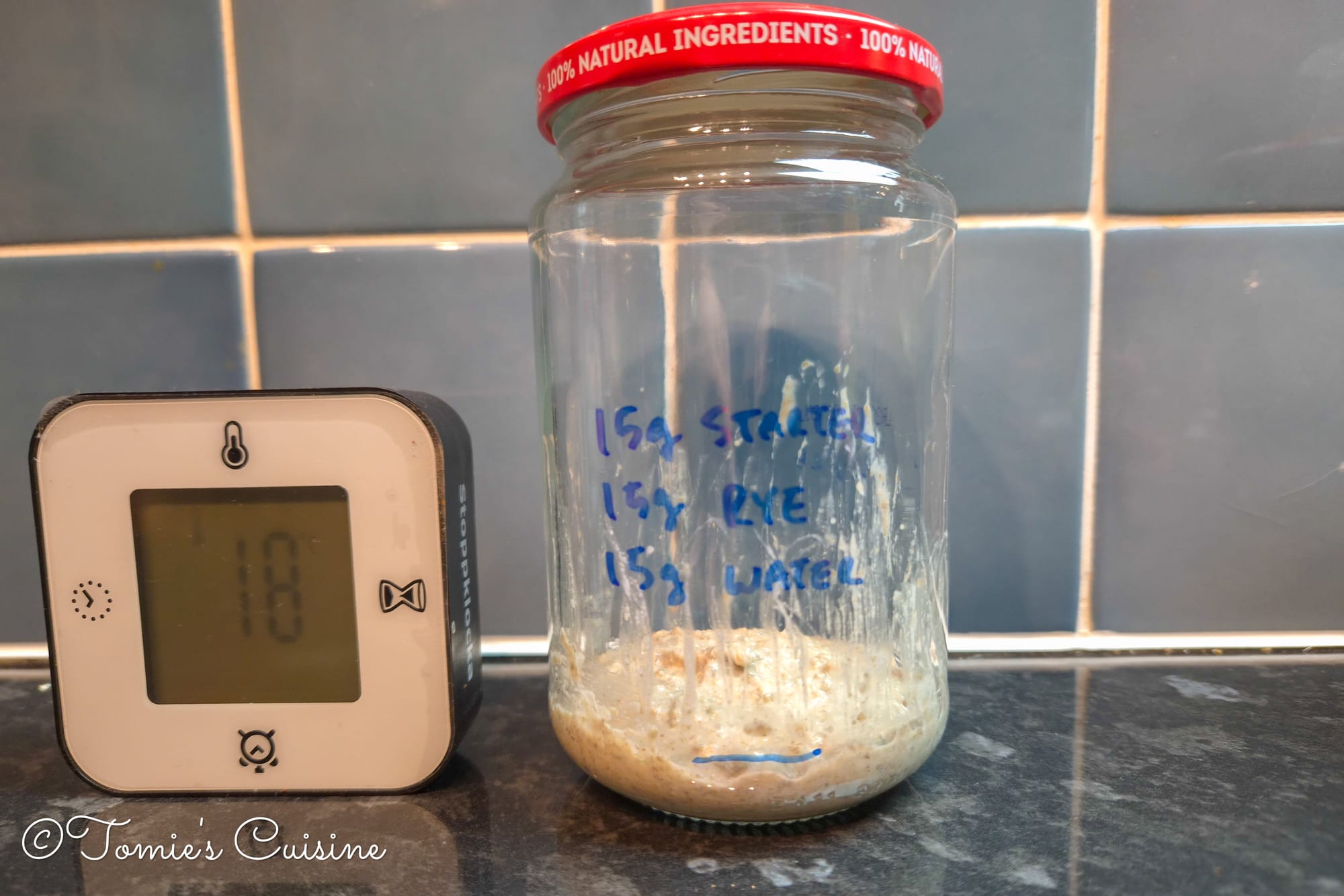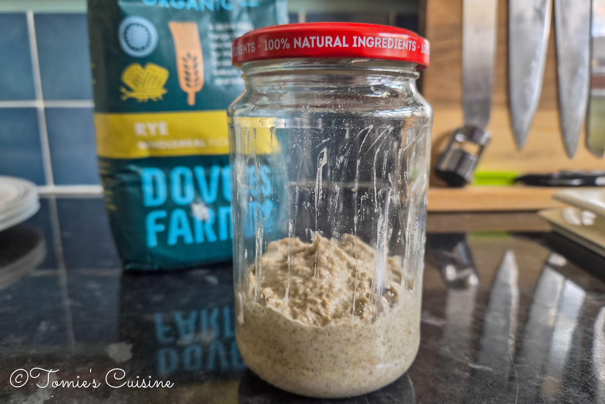 This recipe uses rye flour throughout, and the quantities are intentionally small to minimise waste. You will need a few small to medium-sized glass jars, a kitchen scale, and a little patience!