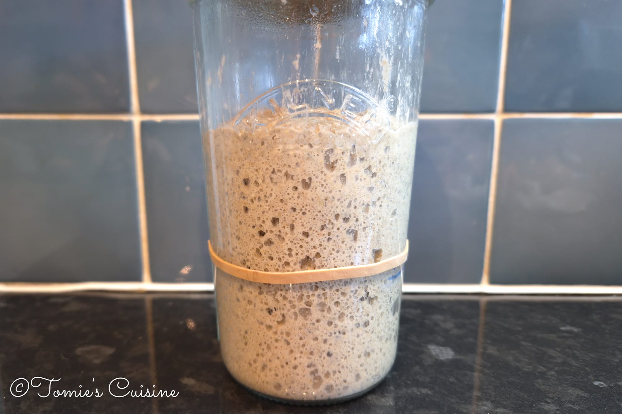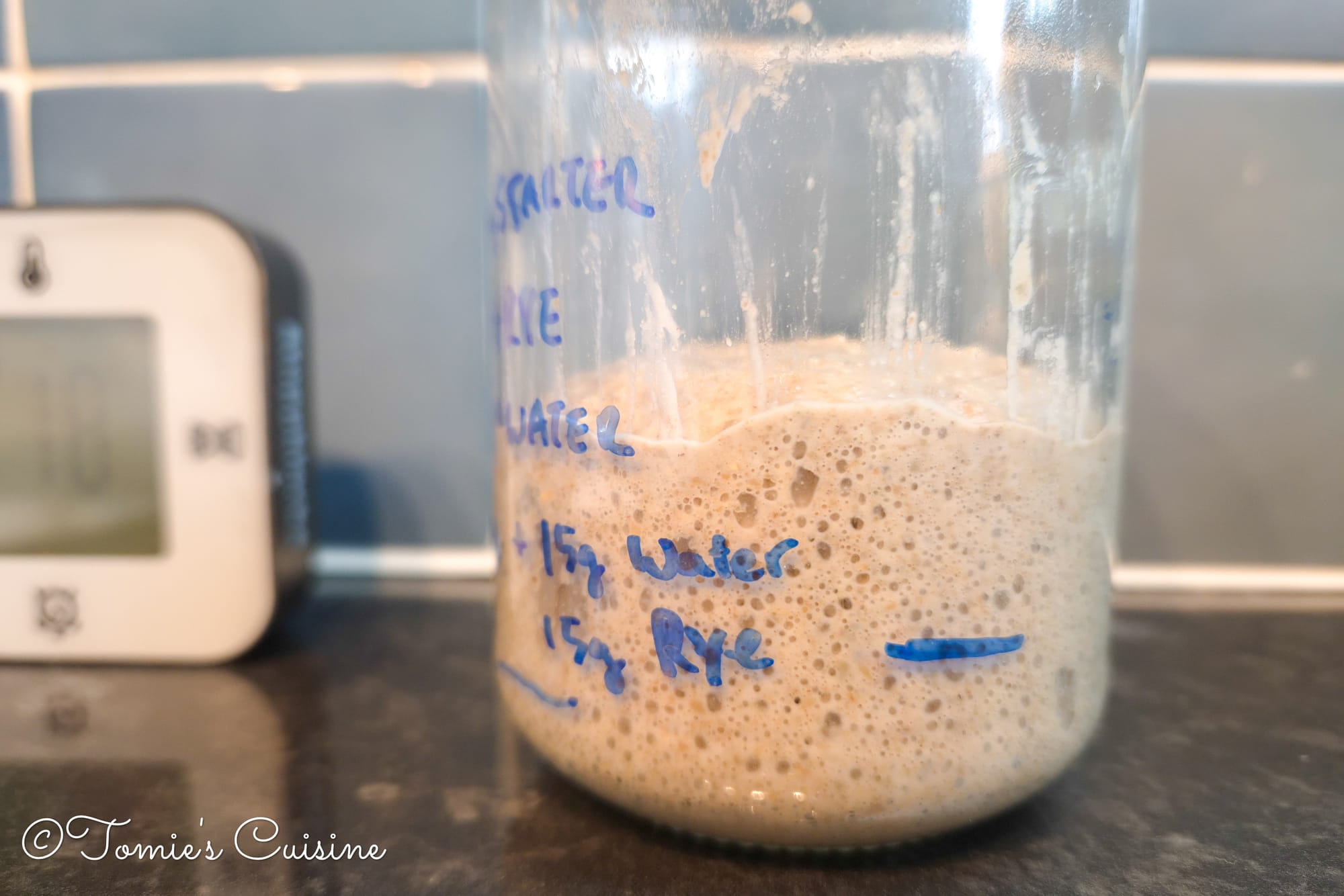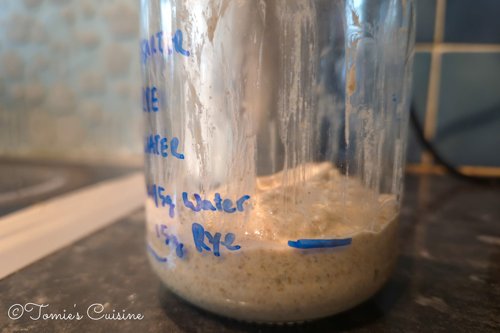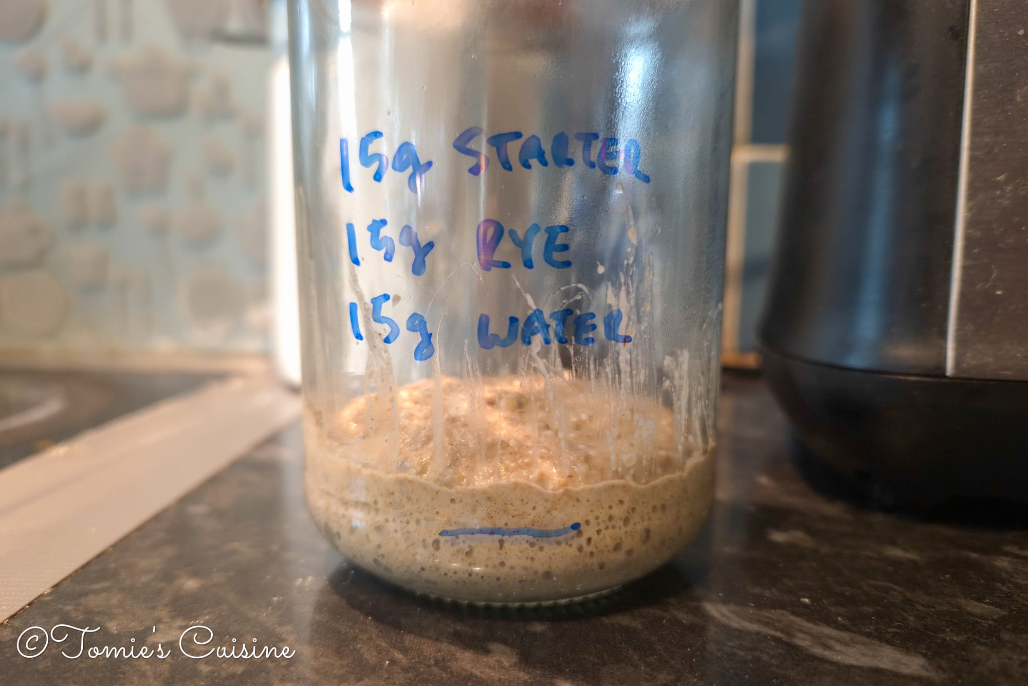 I then put 50g of starter into a clean glass jar and added equal amounts of water and rye flour for the final stage before making the bread dough. It doubled again around 8 pm, as I was keeping it in a warmer spot.