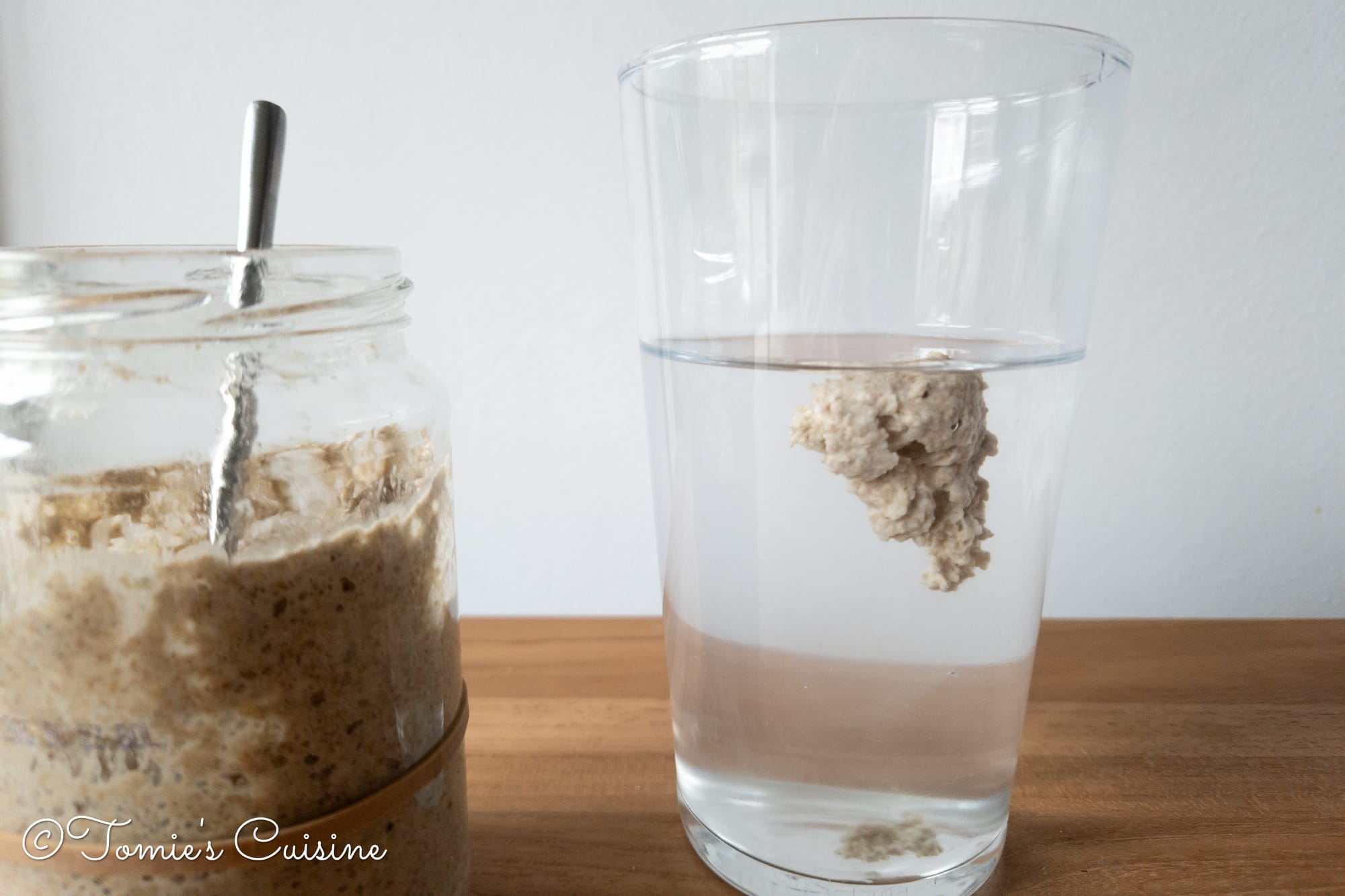 Drop about half a teaspoon of your starter into a glass of room-temperature water. If it floats, it is full of air bubbles from fermentation, which is a good sign that it is active enough to leaven your bread. If it sinks, give it a little more time and another feed.