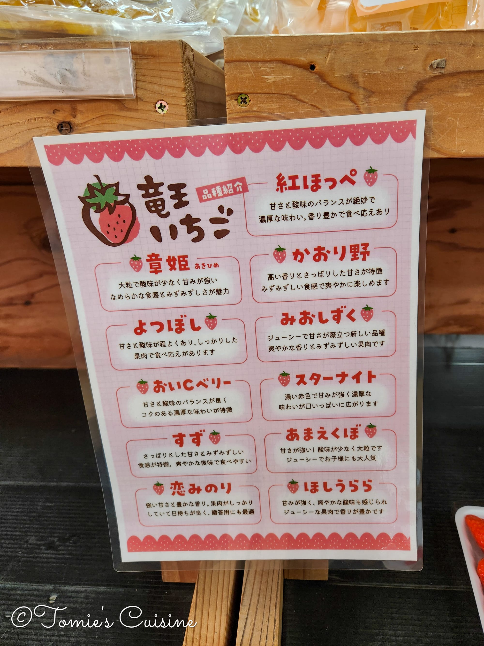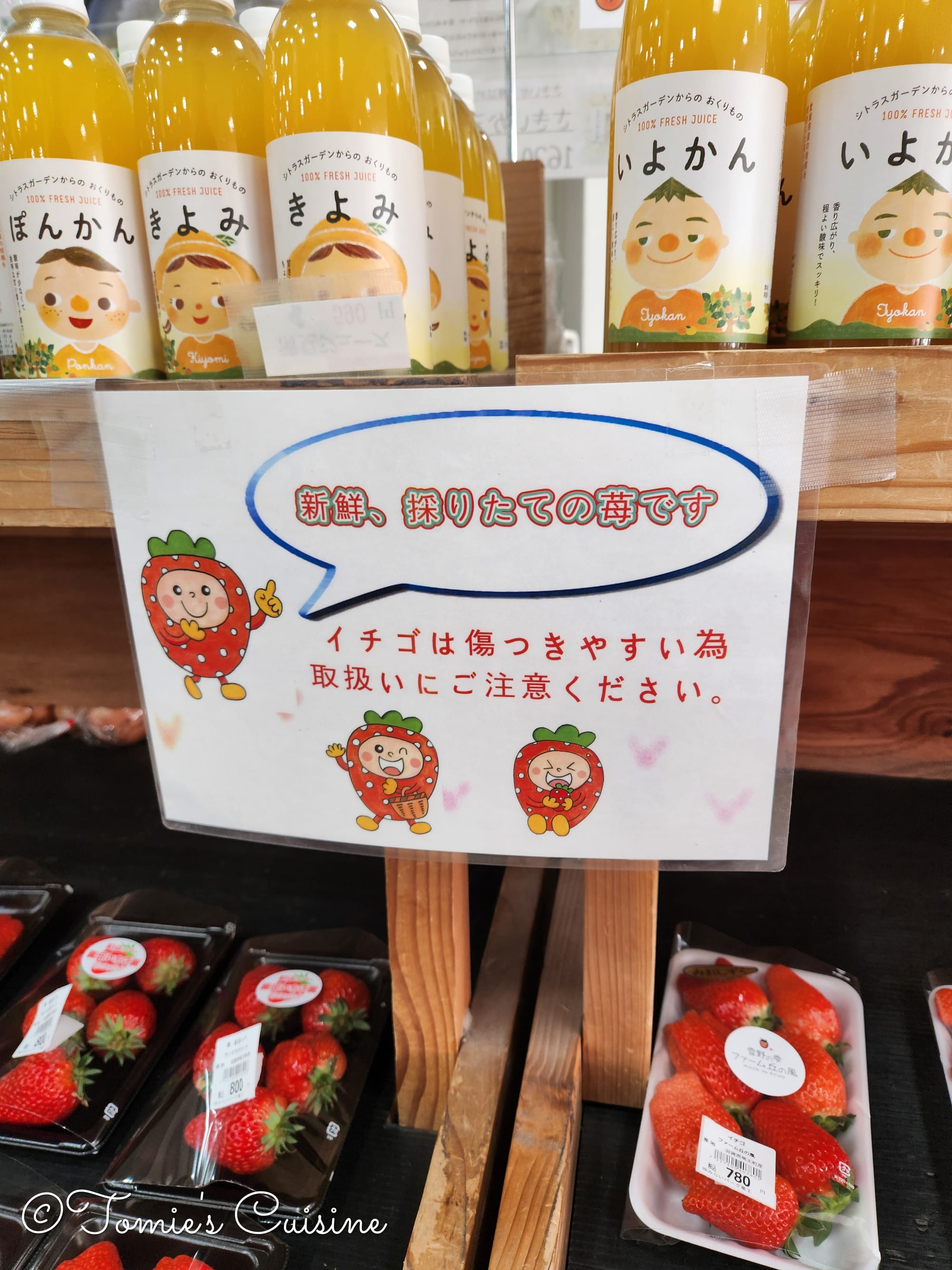 The sign warns that the strawberries are freshly picked and should be handled with care. The other sign displays the different varieties of local strawberries and describes the taste of each one.