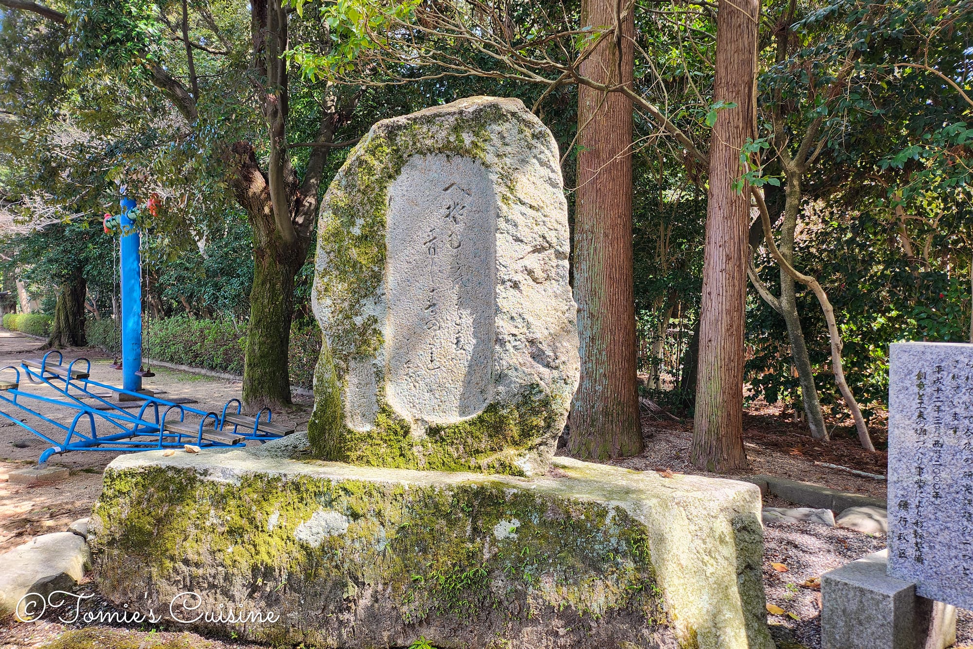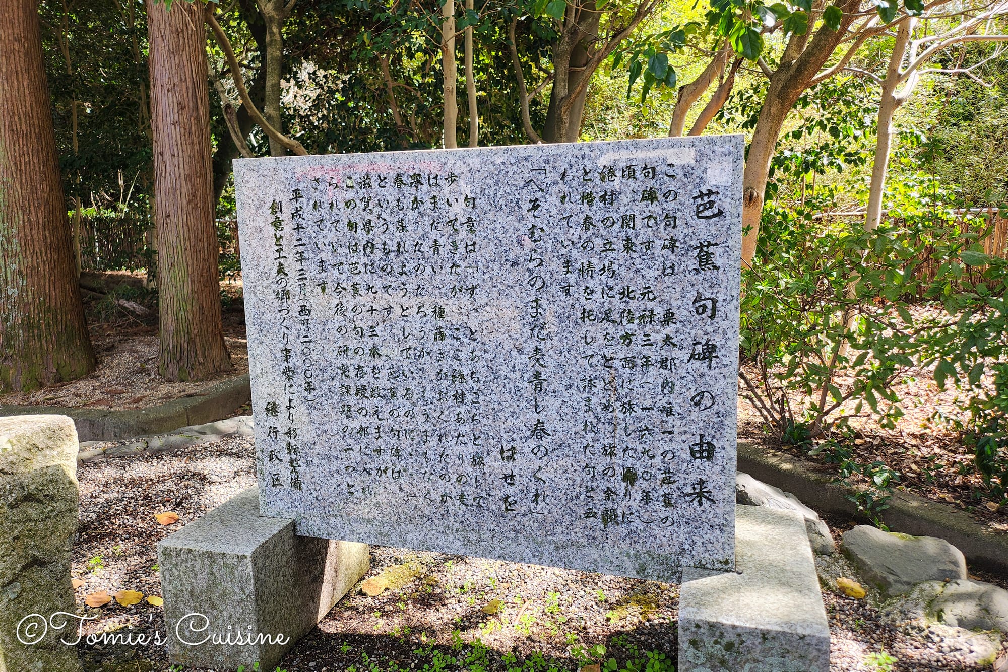Basho-ku-hi (芭蕉句碑) is a statue with the Haiku poetry written by a famous Haiku artist, Matsuo Basho(松尾芭蕉 1644-1694)(left), and the explanation stone board. (right)