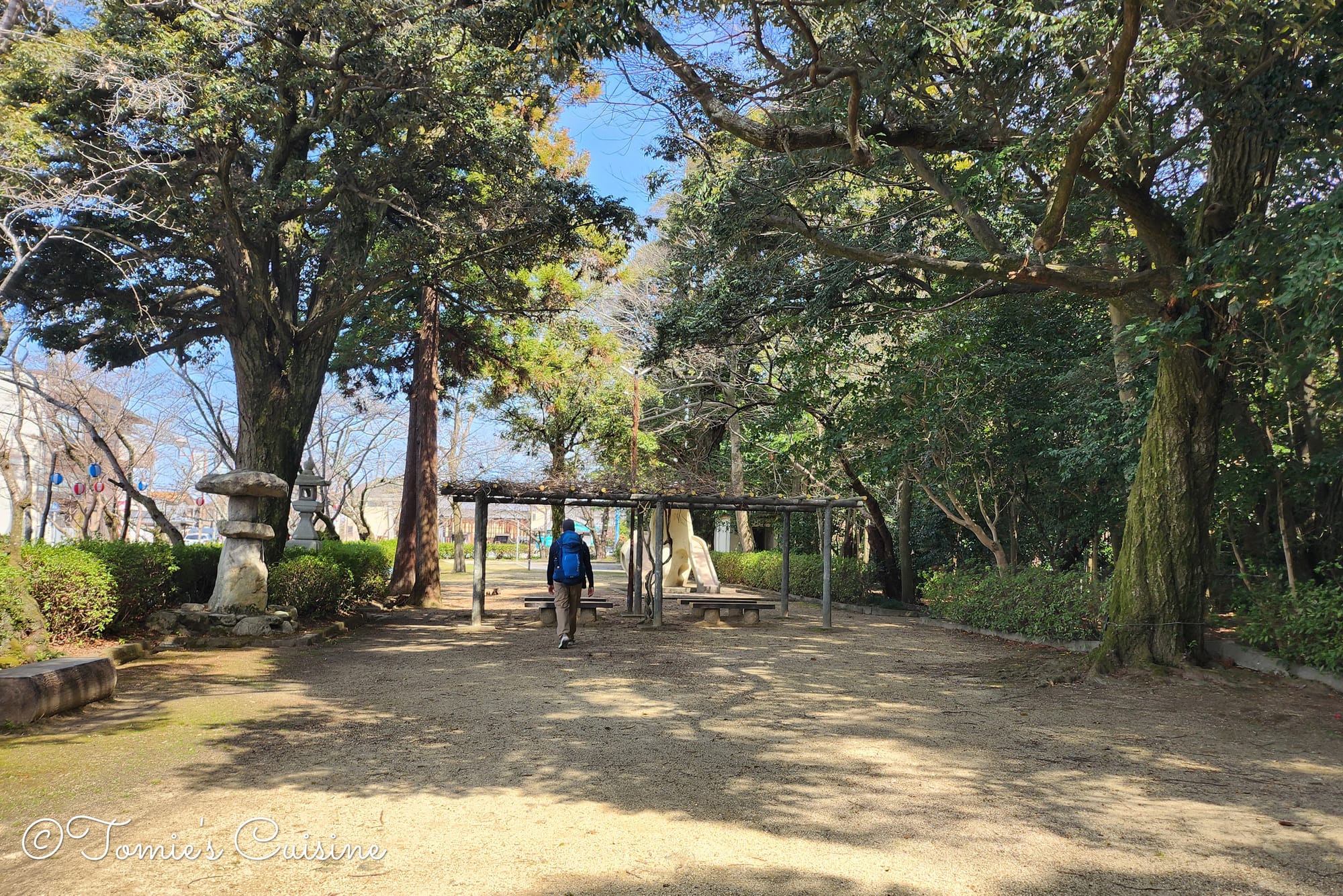 12:10 pm After walking for about an hour, we found a park called Daiho Park (大宝公園) next to Hiyoshi Shrine (日吉神社) and decided it was the perfect spot for a break. We had picked up sandwiches from a convenience store and enjoyed them for lunch. The park also had a public toilet, which was very convenient.