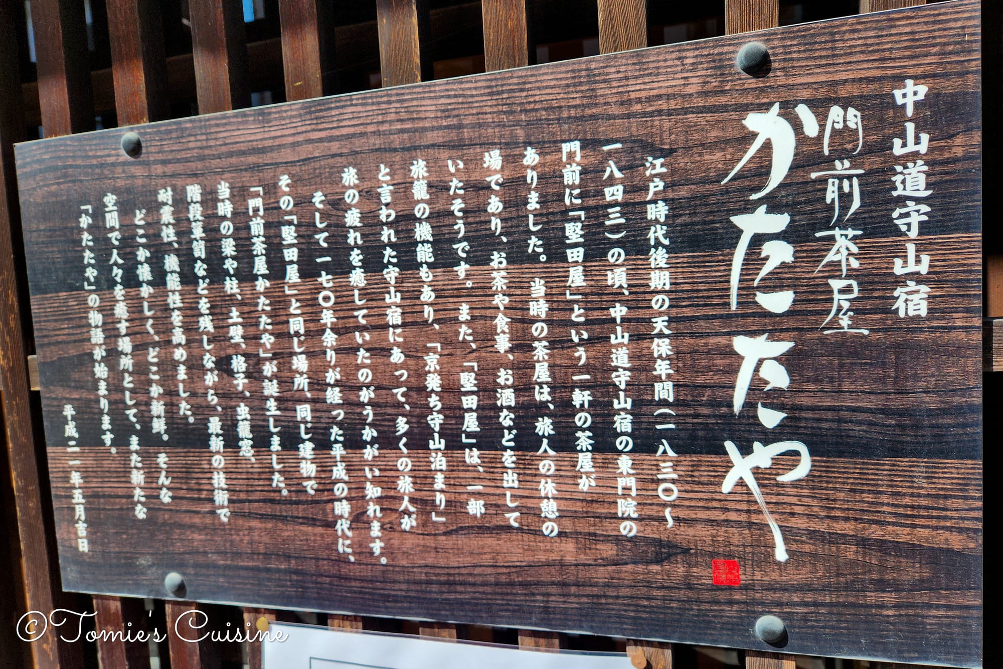 Going through Moriyama post town. From the top left, a direction sign, an explanation board of a tea house called "Katataya (かたたや)", a street view of Moriyama, a stone direction signpost to indicate "To the right, Nakasendo Mino road", "To the left, Nishikori temple", and the explanation board about the stone signpost.