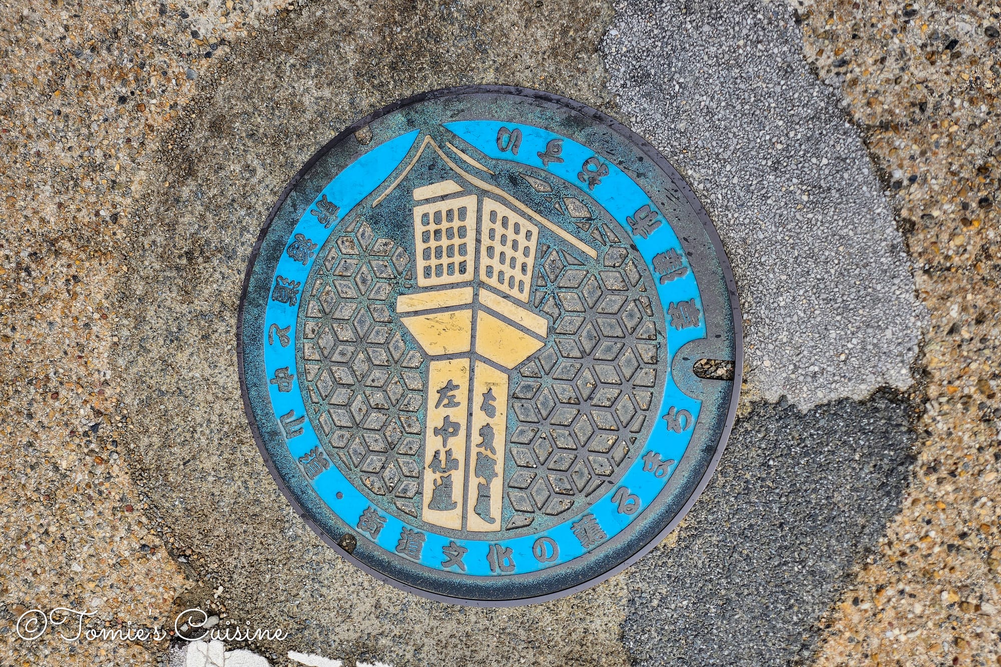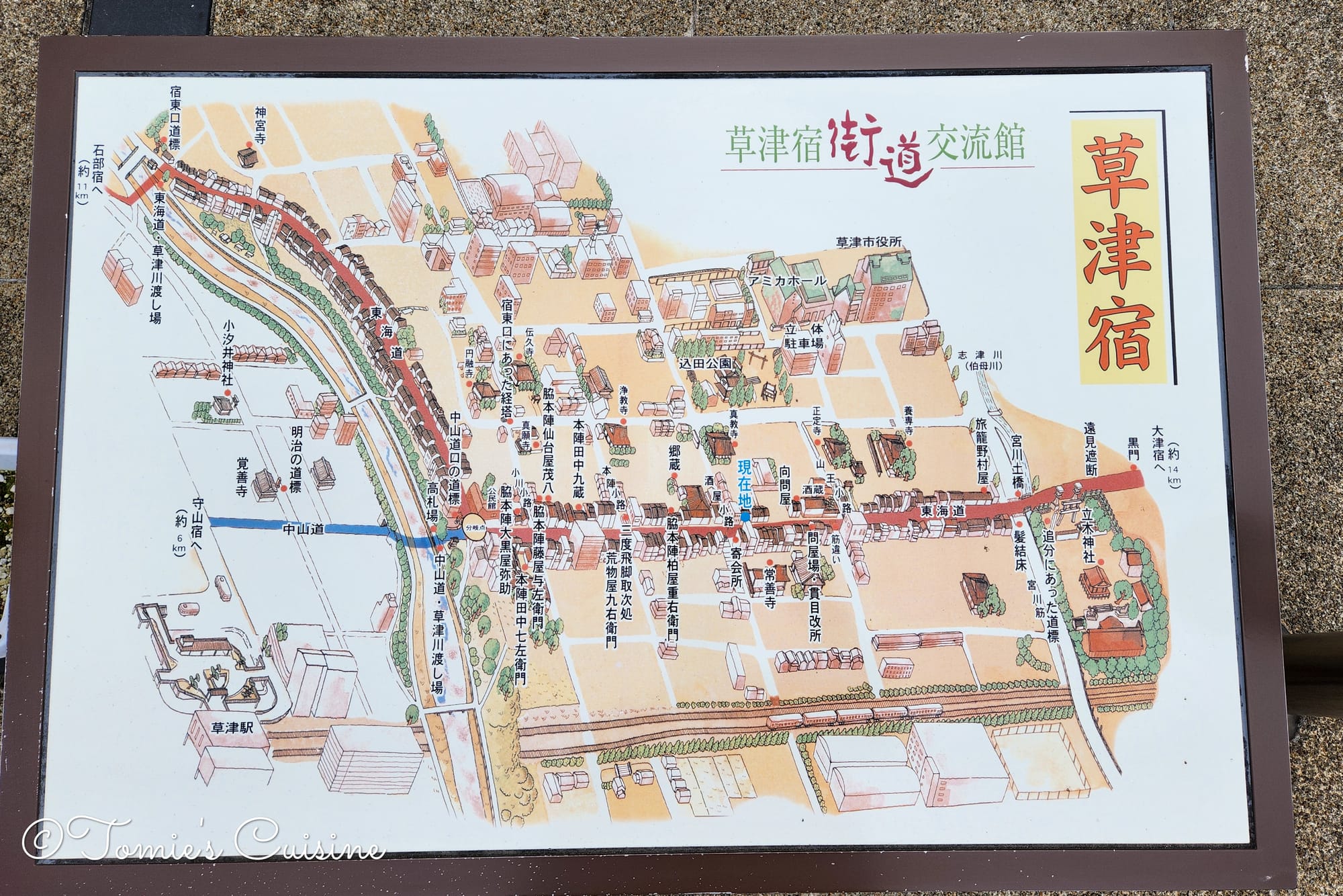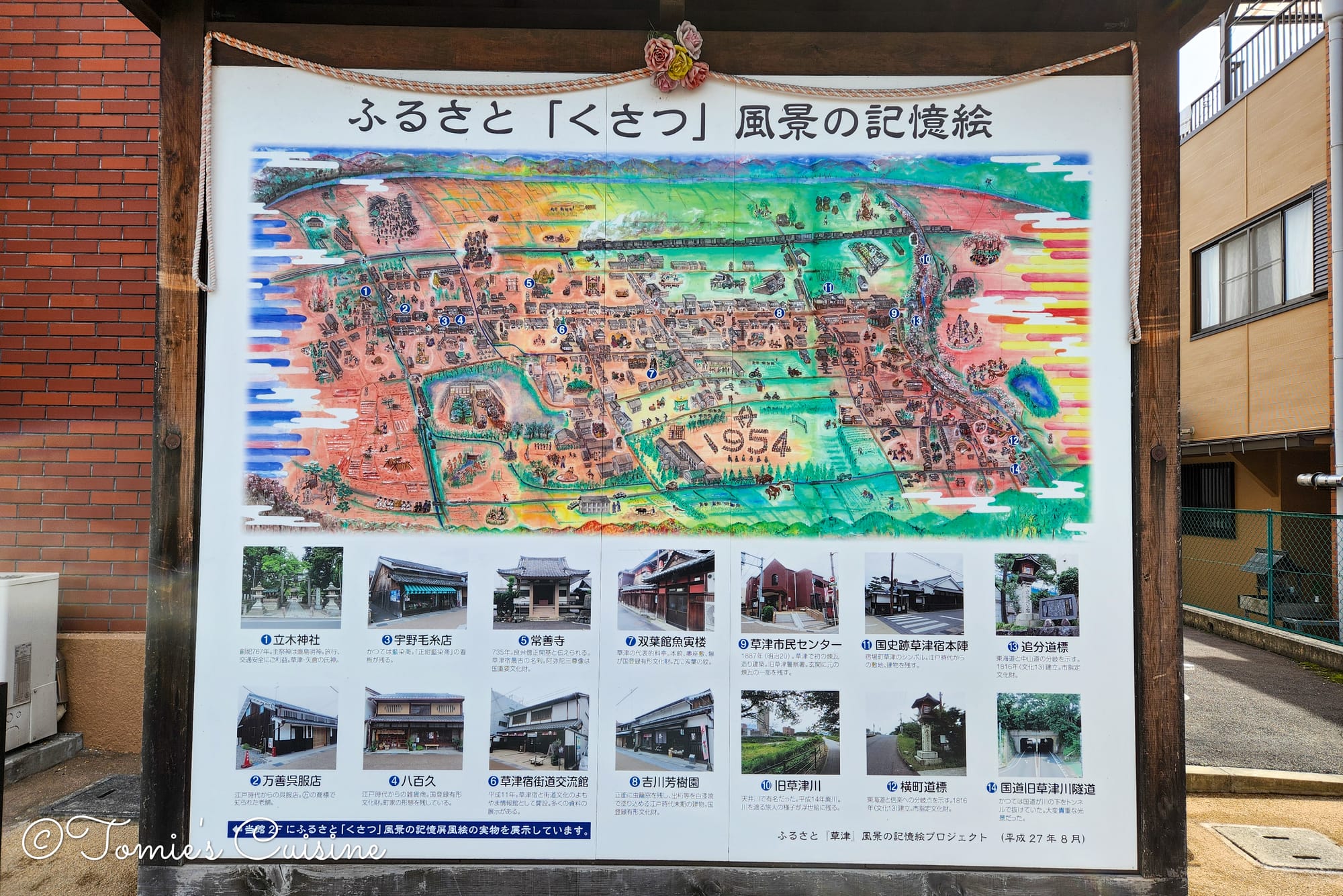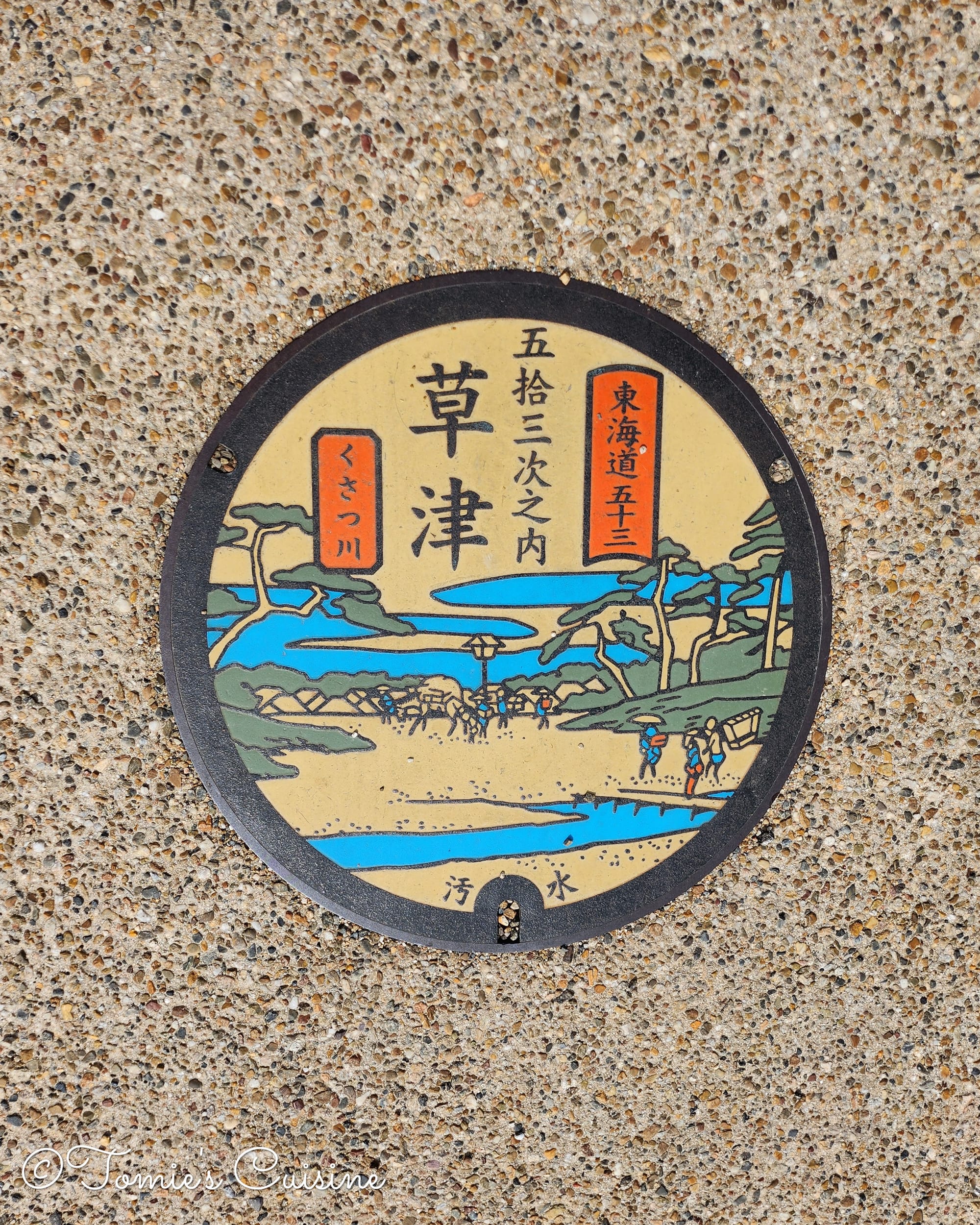 On the way to Kusatsu, there were several shrines, manholes with a local design, a map of Kusatsu post town, and Tokaido signs.