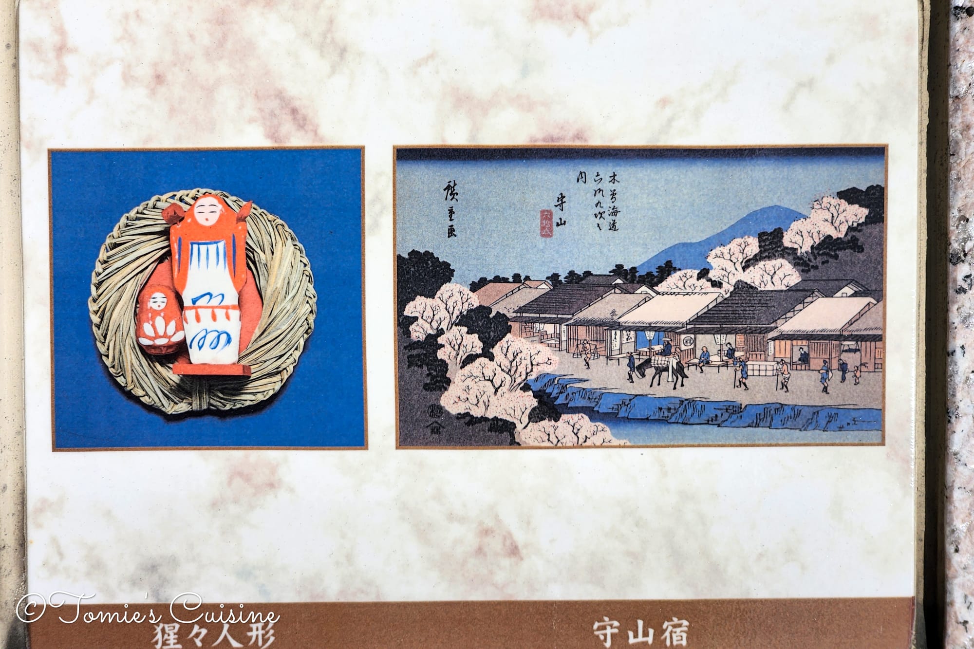 On the right is a Ukiyo-e print of Moriyama post town, and on the left is a traditional local amulet for children, known as the "Shoujou doll (猩々人形)".