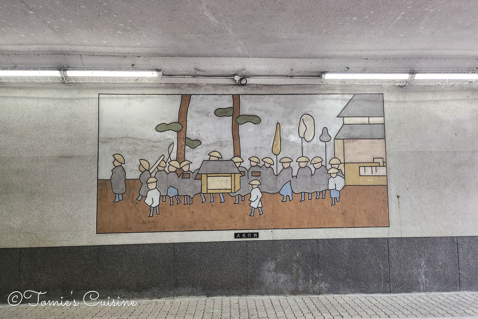 On the left is a historical scene depicting a Daimyo procession in the tunnel. In the middle is a shrine with the Nakasendo sign. On the right is a fresh frozen sweets vending machine.