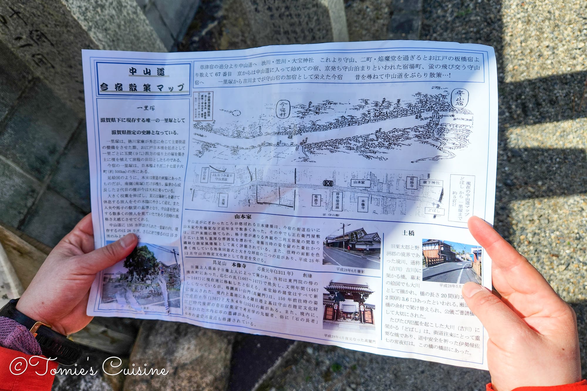 Photos of the view that we saw between Imajuku and Moriyama post town. The paper I'm holding is a free map of Imajuku on Nakasendo from Juge shrine.