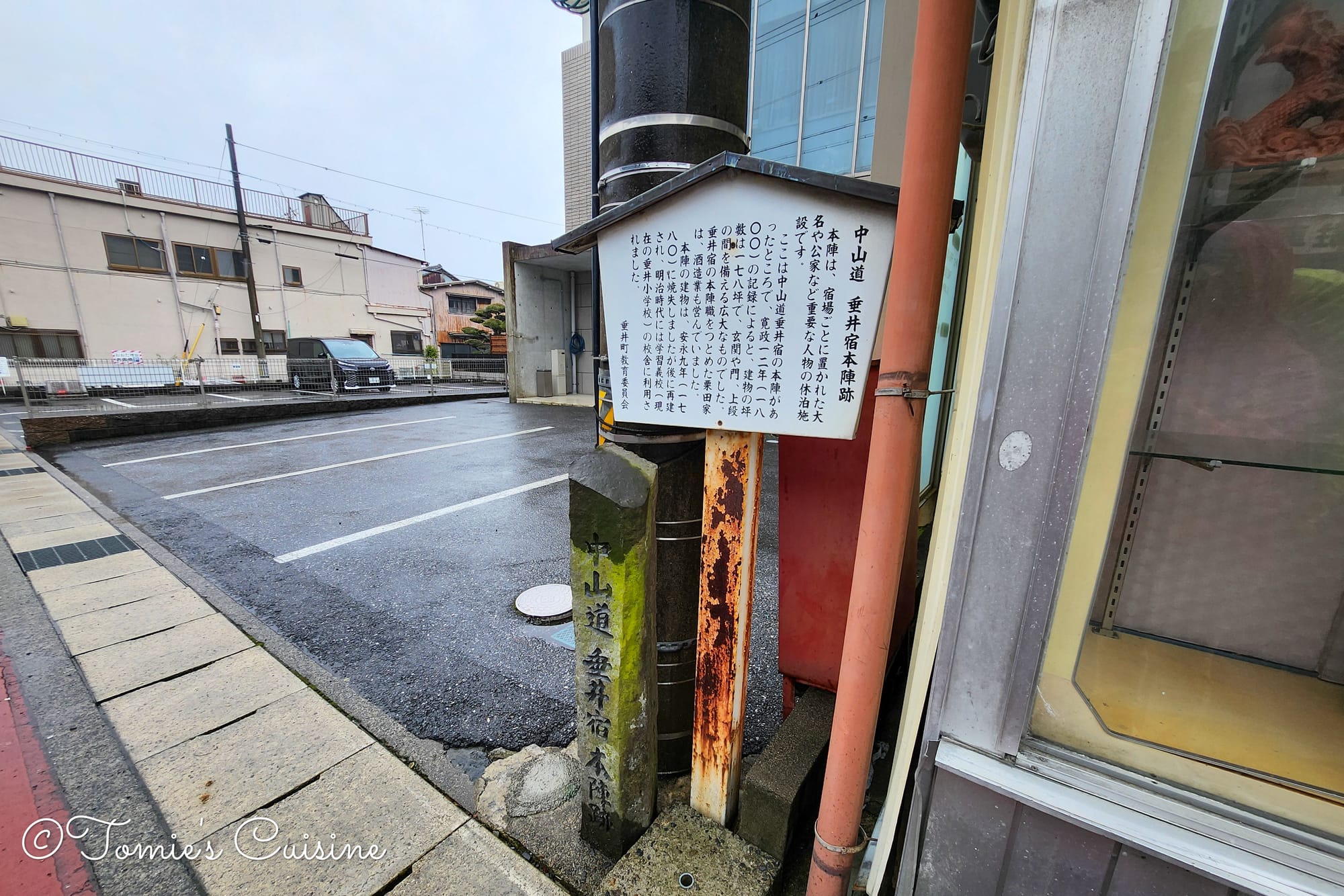 When you are walking on Nakasendo, you will see those old (style) signboards that show the business the place used to run. Then, if you look more closely, you will notice that one side is written in Kanji and the other in Hiragana. So, when coming from Kyoto, you see the Kanji side, and when coming from Tokyo, you see the Hiragana side. We saw a few of them in Tarui post town. That was our first time seeing those signs after watching it on YouTube.