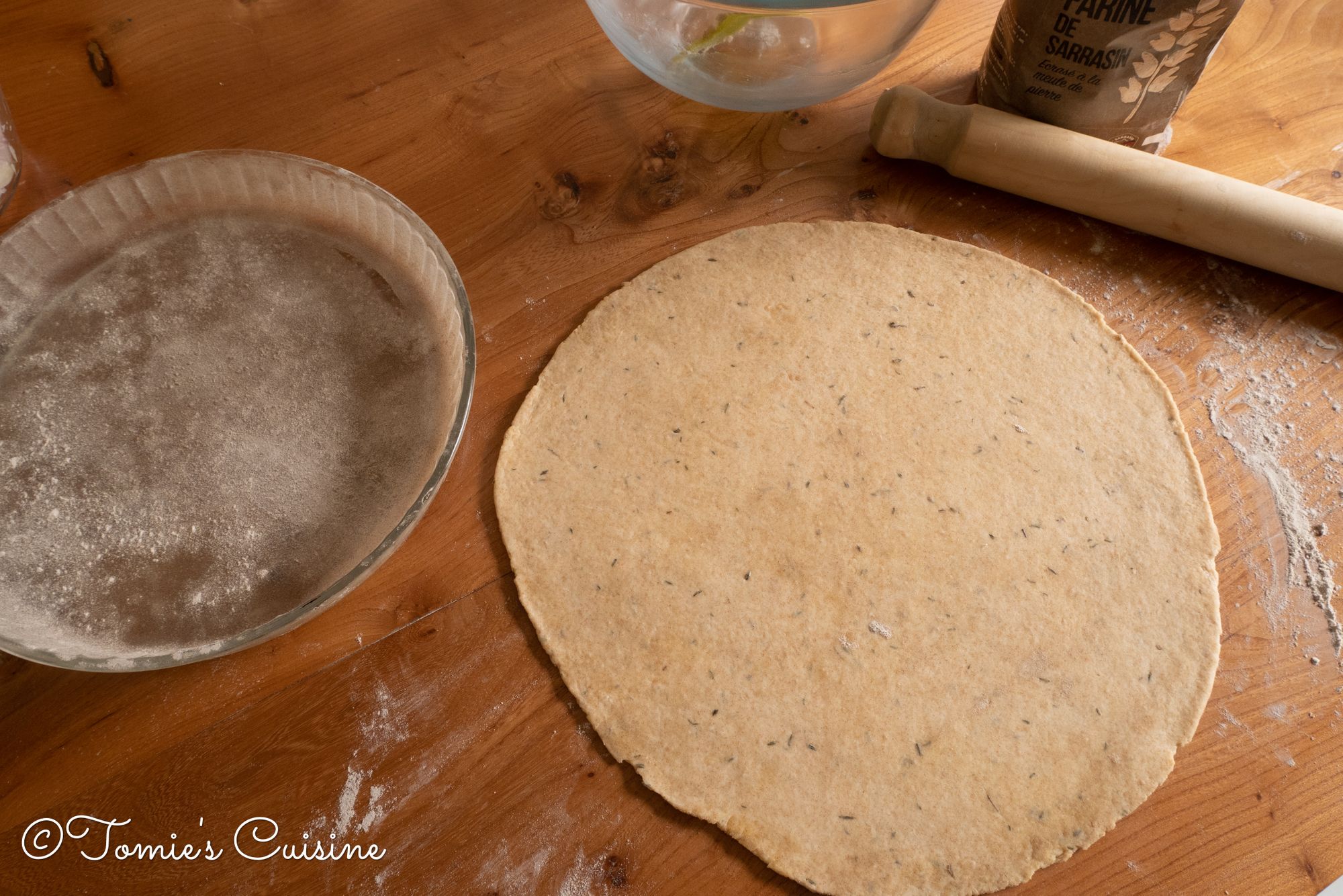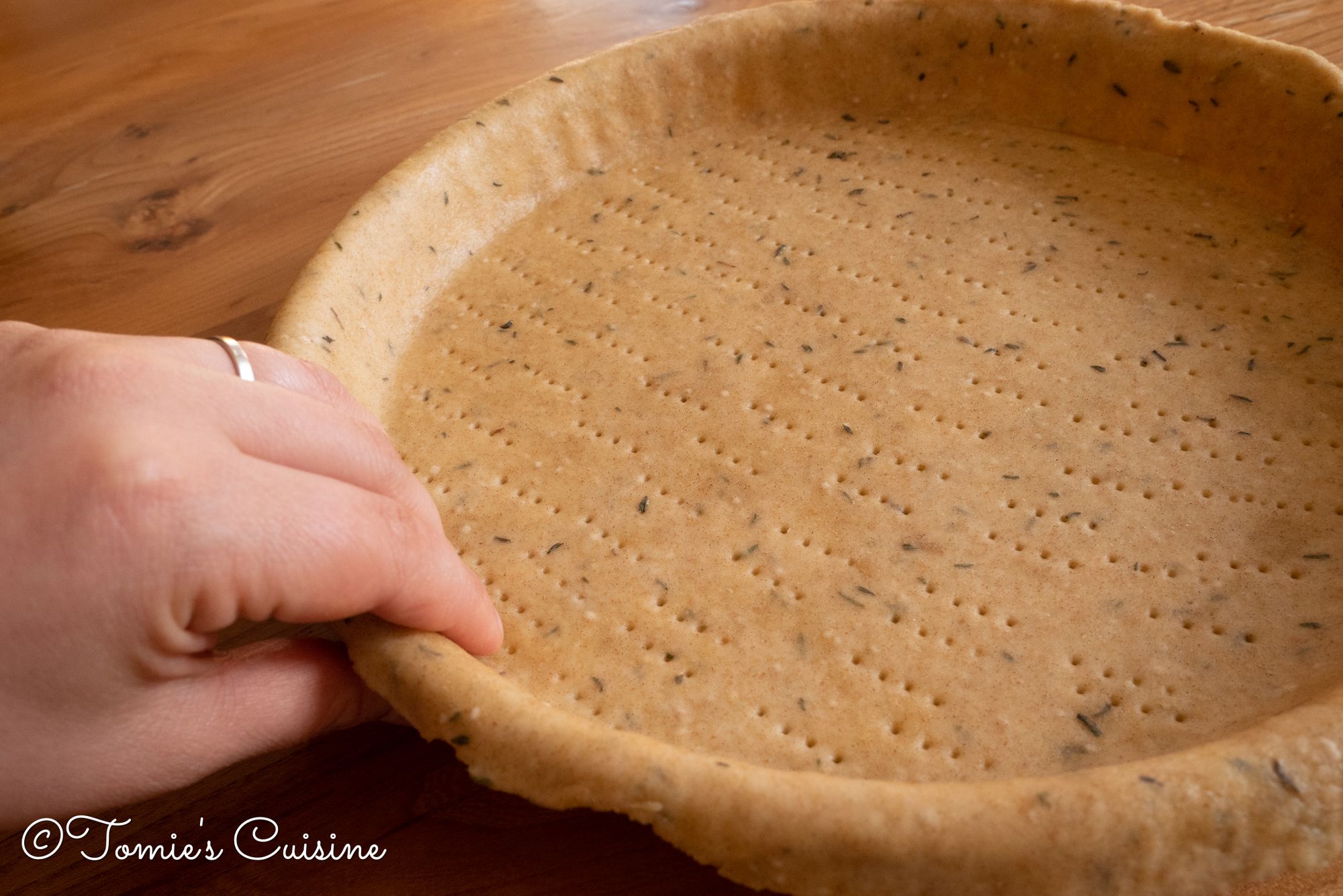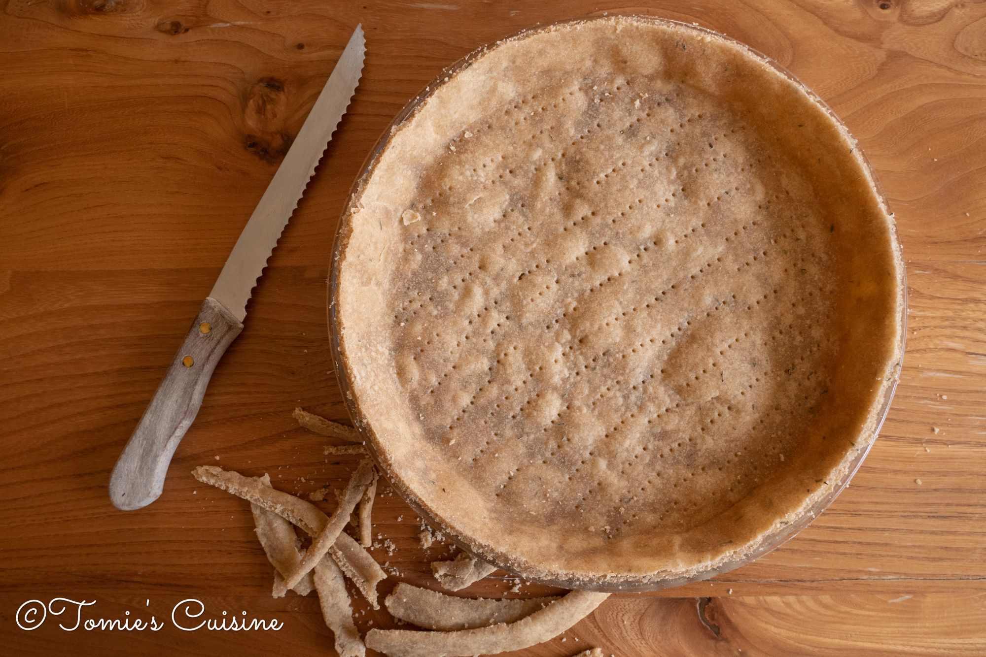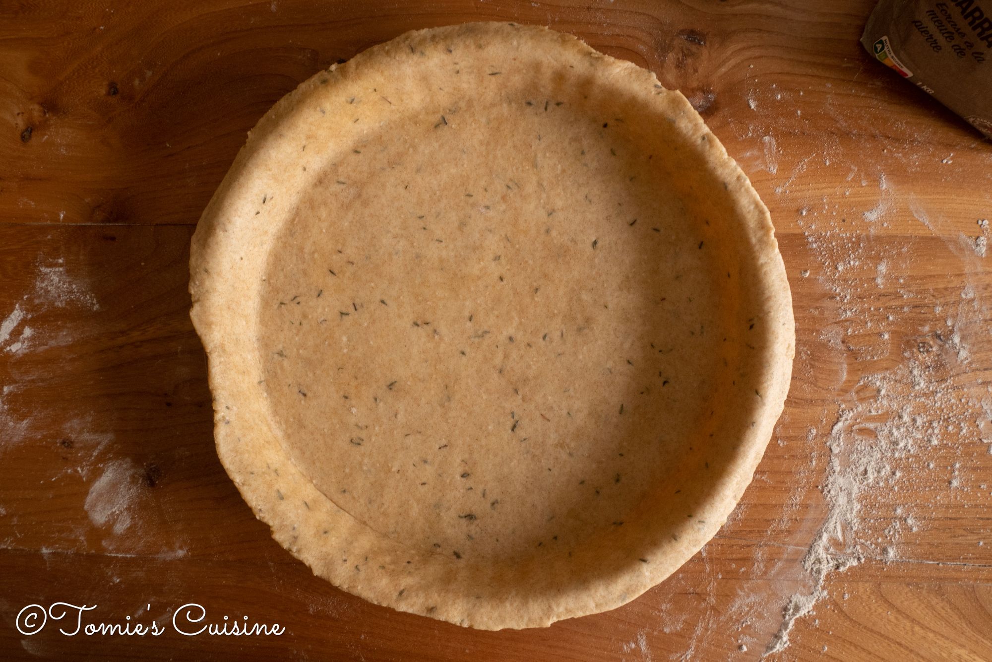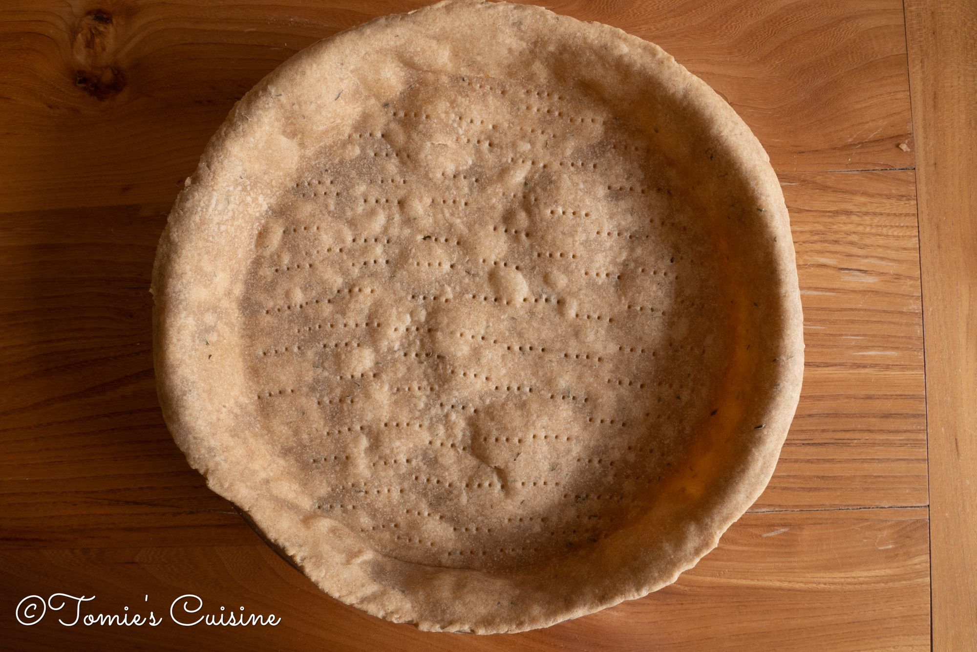 Usually, I prepare a buttery tart pastry for most of the tarts I serve, but I thought I could try something different for a change. So I made a vegan tart pastry from a recipe I found on this website. The ingredients are only T80 flour, olive oil, water, salt and herbs.