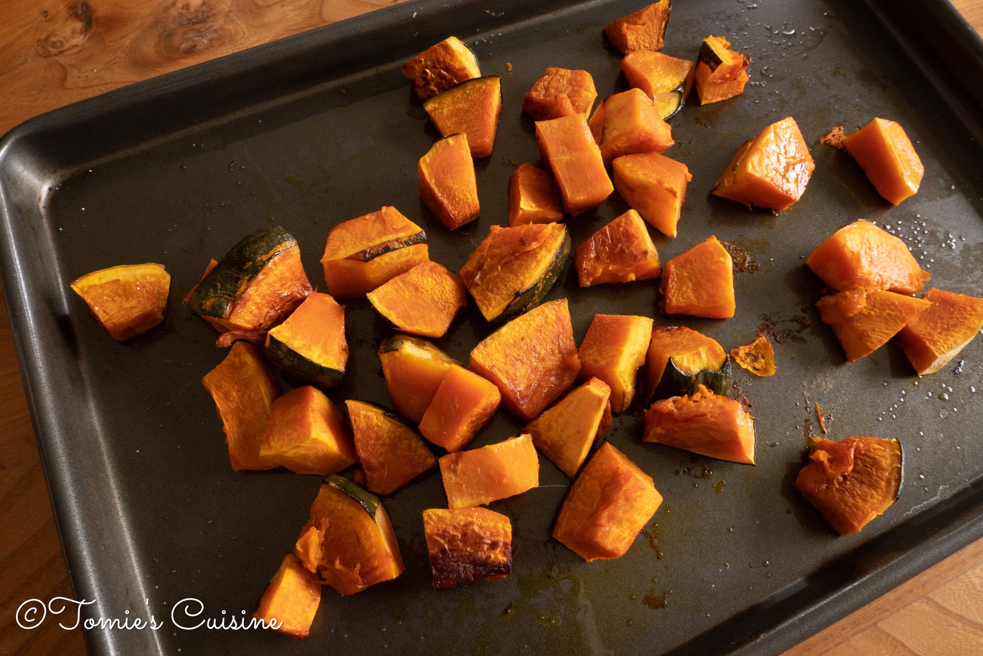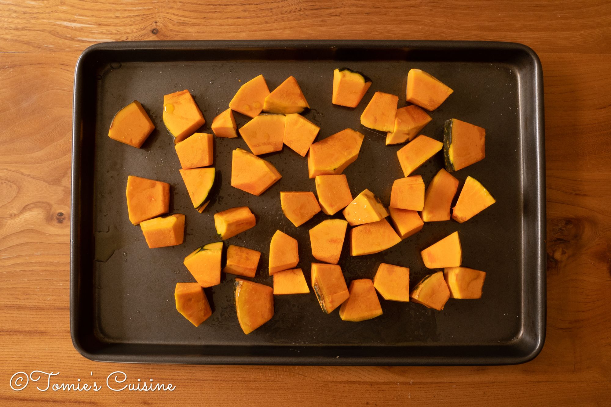 - Bring the oven to 180°C and place the baking tray with the seasoned pumpkins bits.