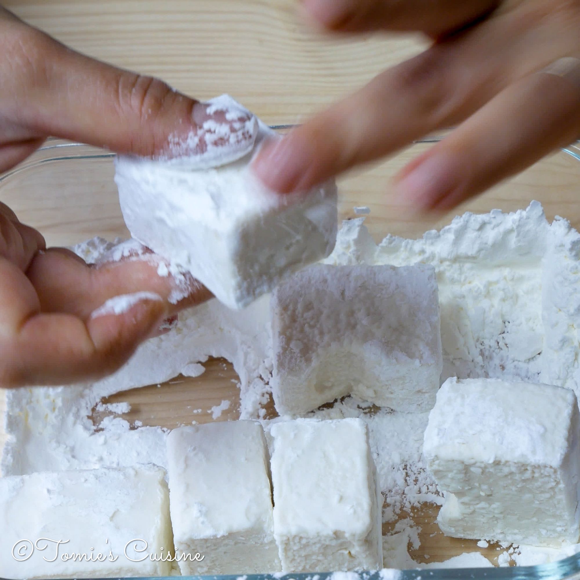 It’s essential to put the corn flour-coated tofu into the heated pan straight away. If you leave it on a clean surface like plates or chopping boards, the coated cornflour sticks to the surface, losing the coat.