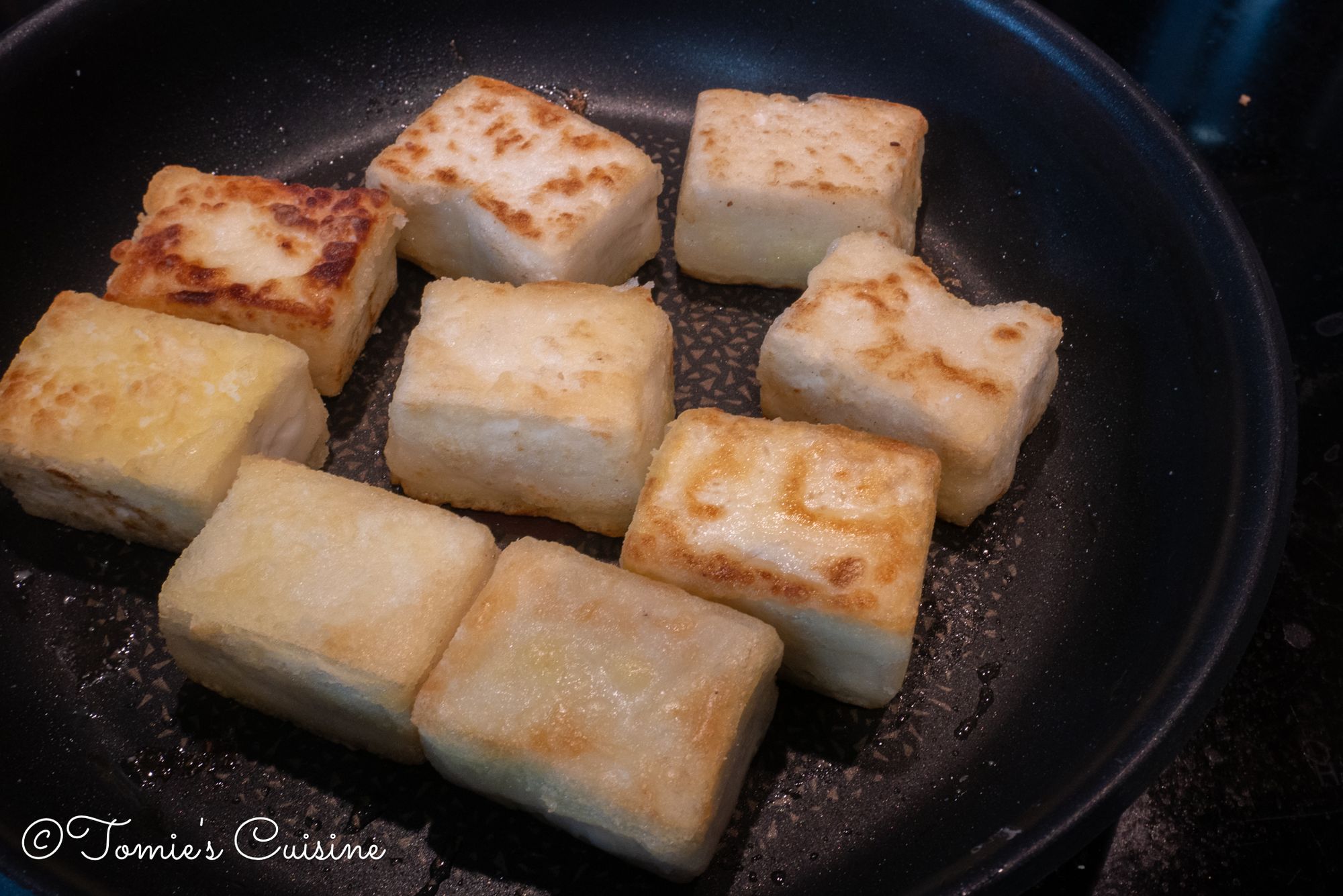 - Heat a pan with medium heat and pour some oil. Coat the tofu with corn flour and add them to the pan one at a time. (tip!)