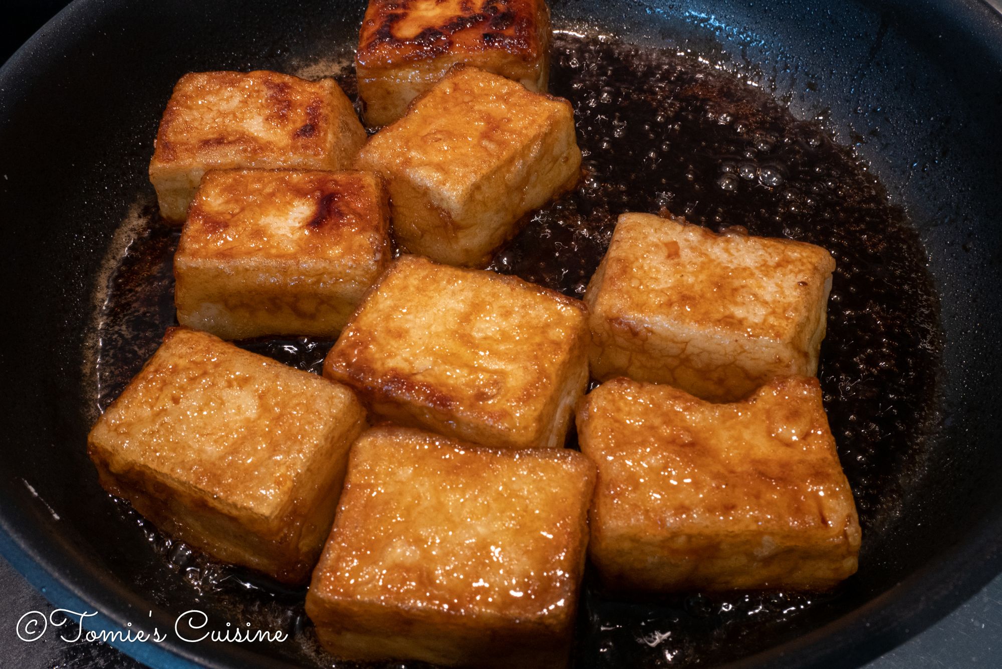 - Coat the tofu with the sauce and cook until the sauce gets thicker. Keep an eye on them to avoid burning the sauce.