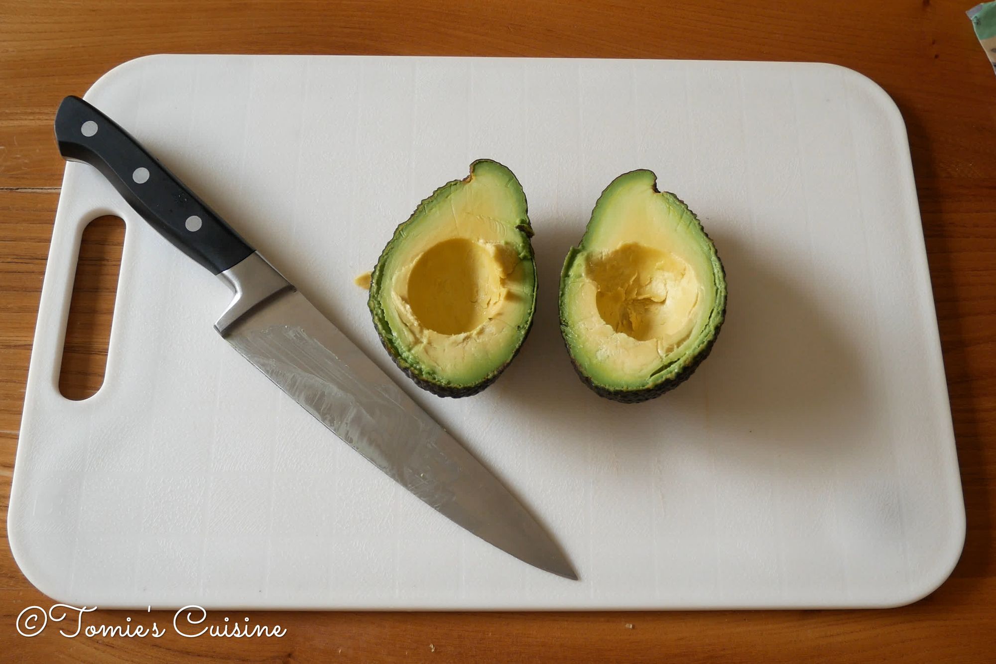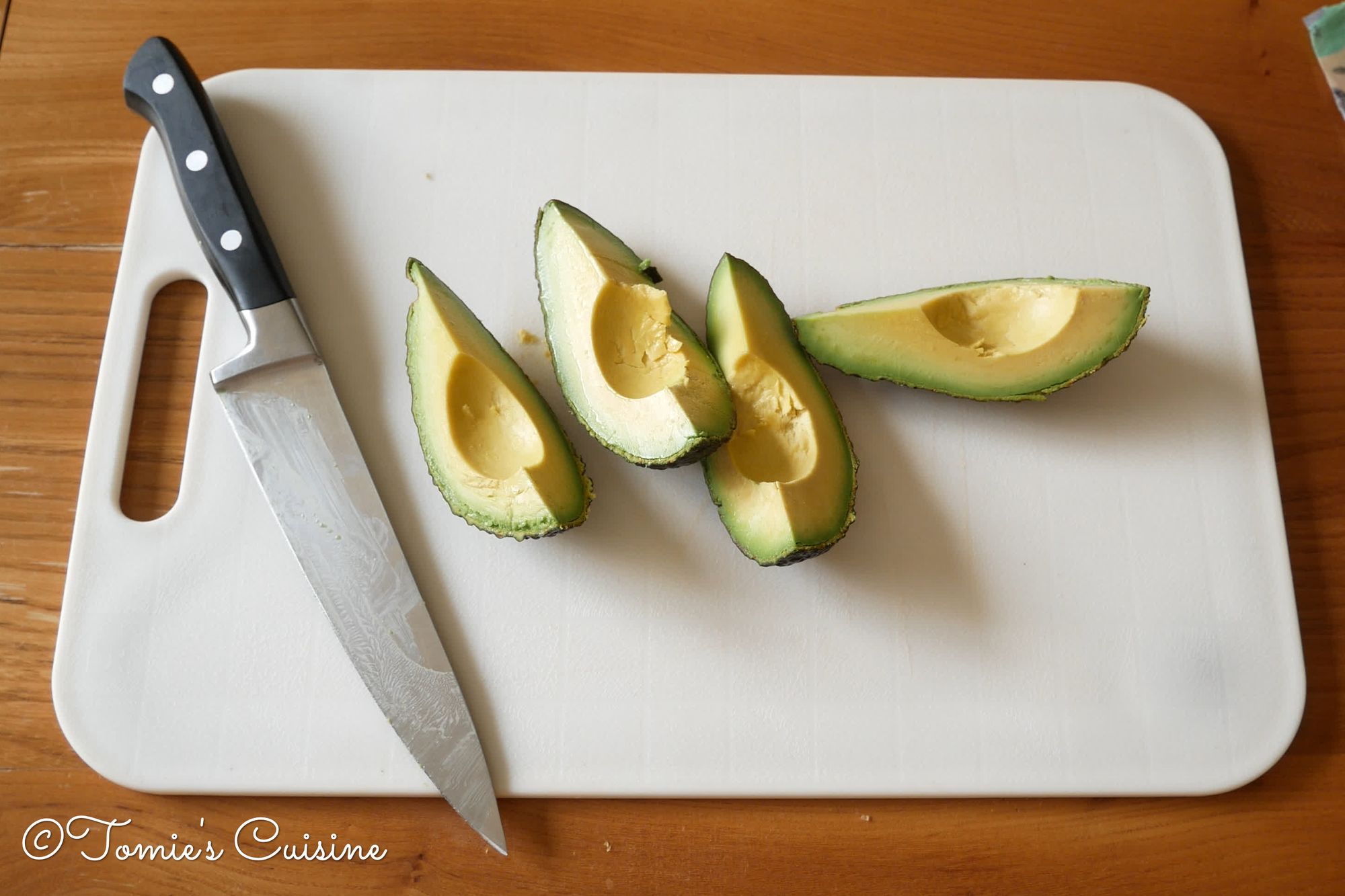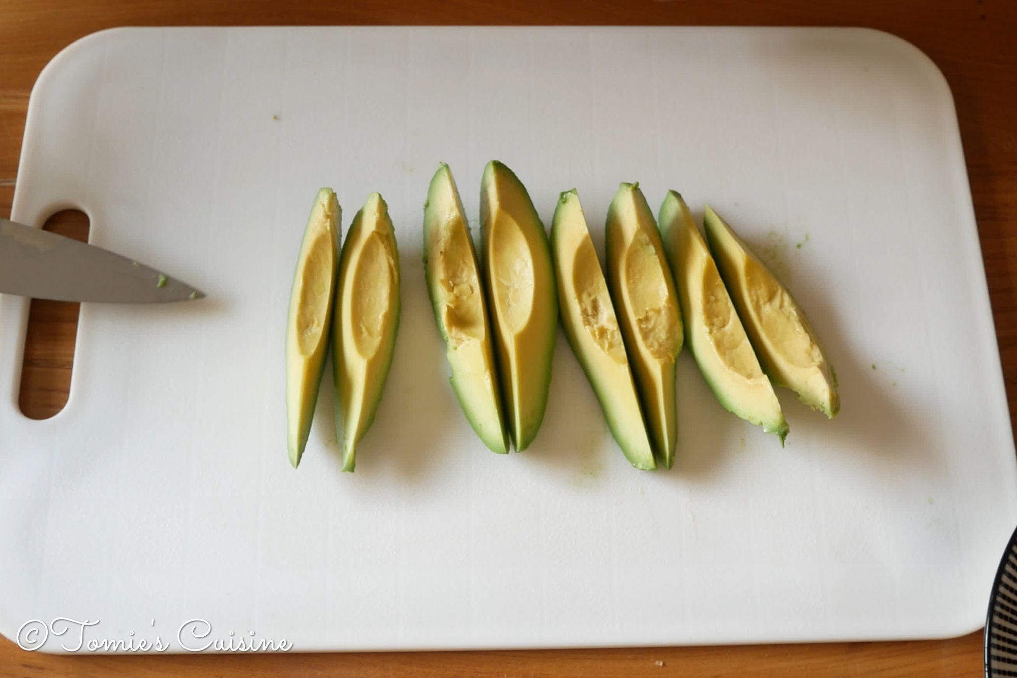 - Amount example: I cut an avocado into a quarter, then cut the quarter avocado into half. It depends on the size of it, but usually, put 2 in a row.)