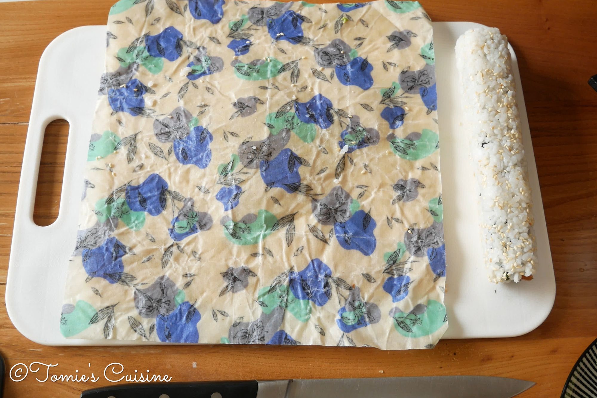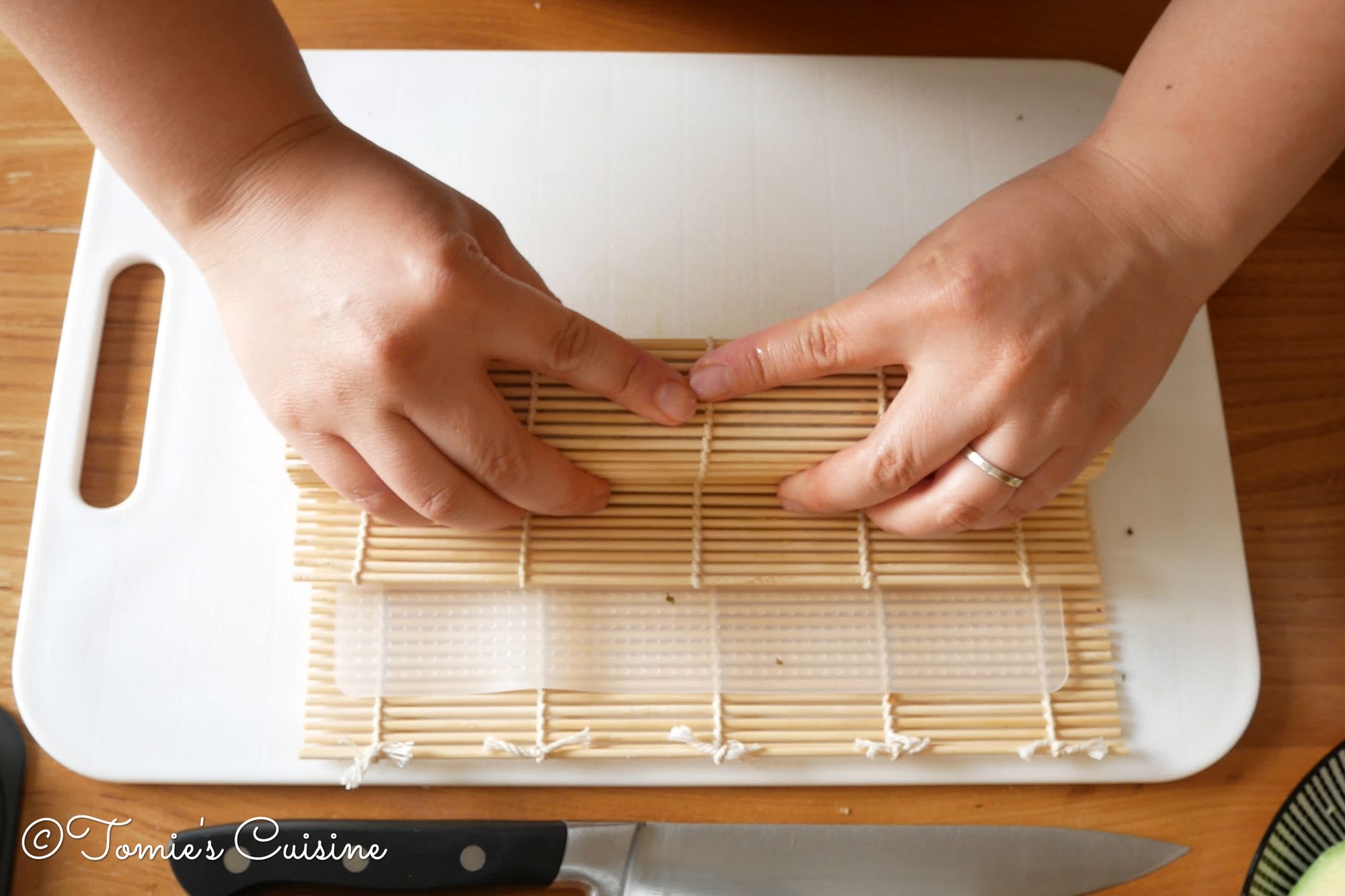 - Place a makisu (mat woven from bamboo and cotton string) on your clean work surface. (chopping board)