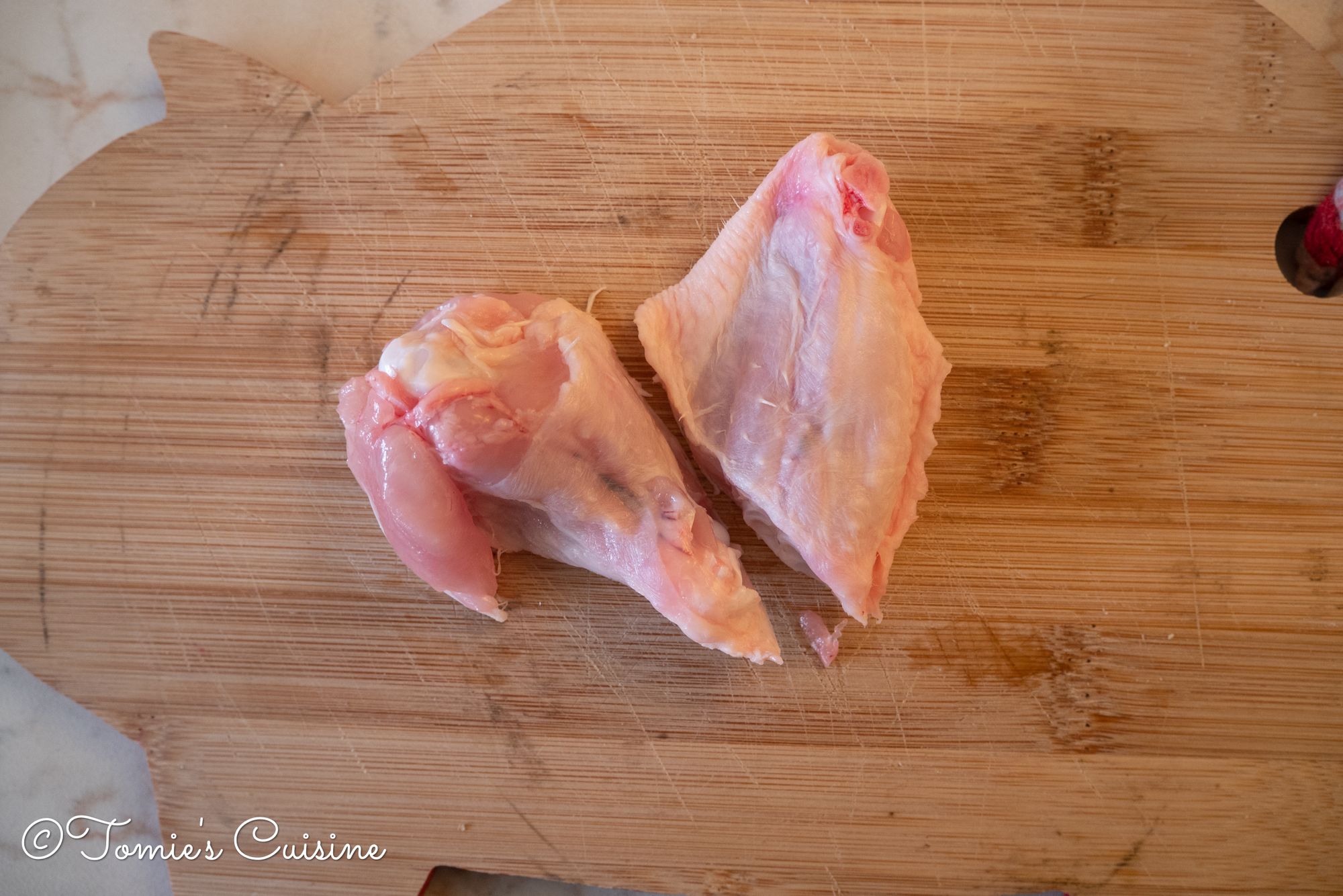- If the chicken wings you bought are like mine, cut the chicken wings into two parts. Drumette and wingette. If they are wingette and tip, leave them like that. Cutting through the cartilage will be very easy for you to cut. (make sure you put a wet cloth under the chopping board to avoid slip)