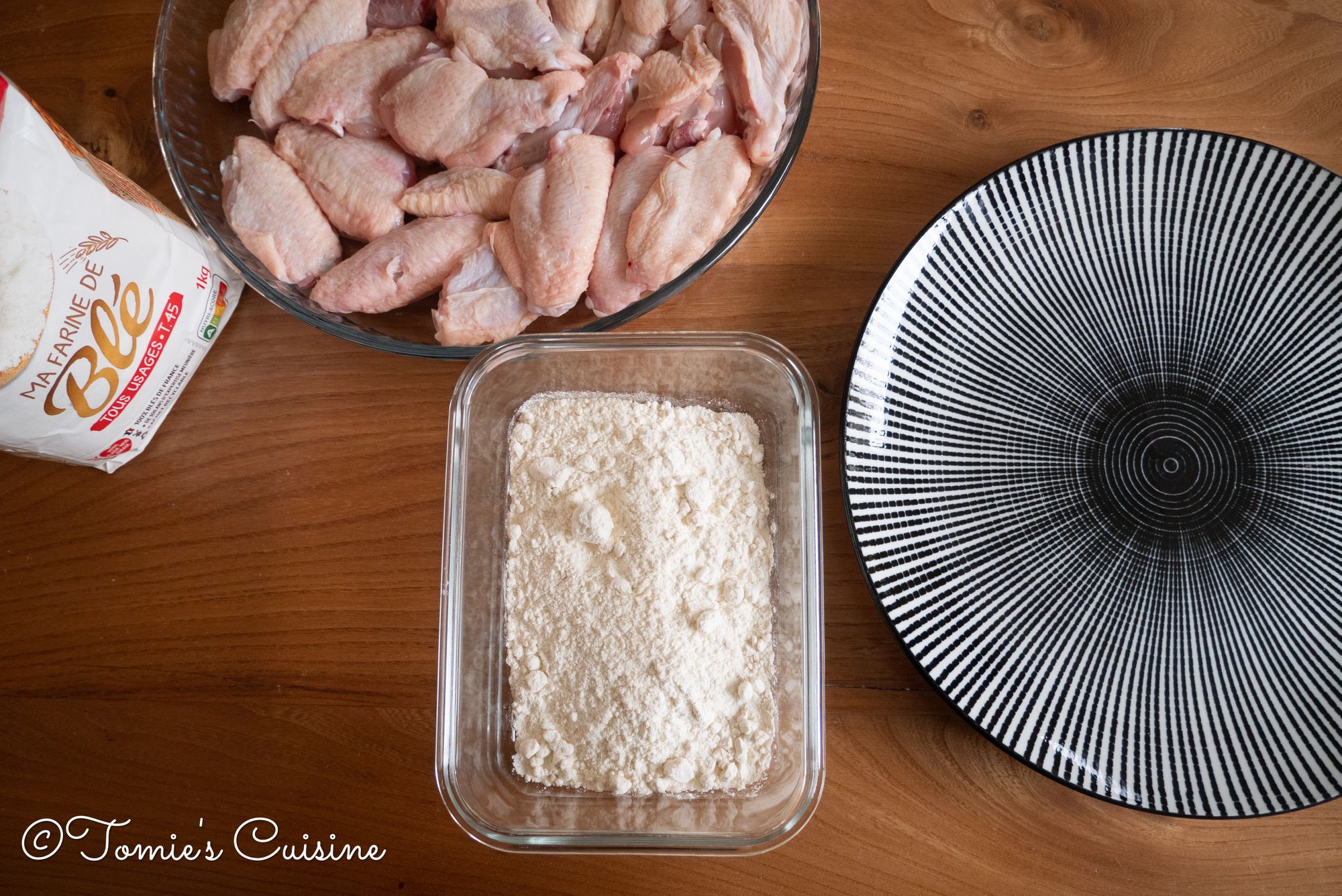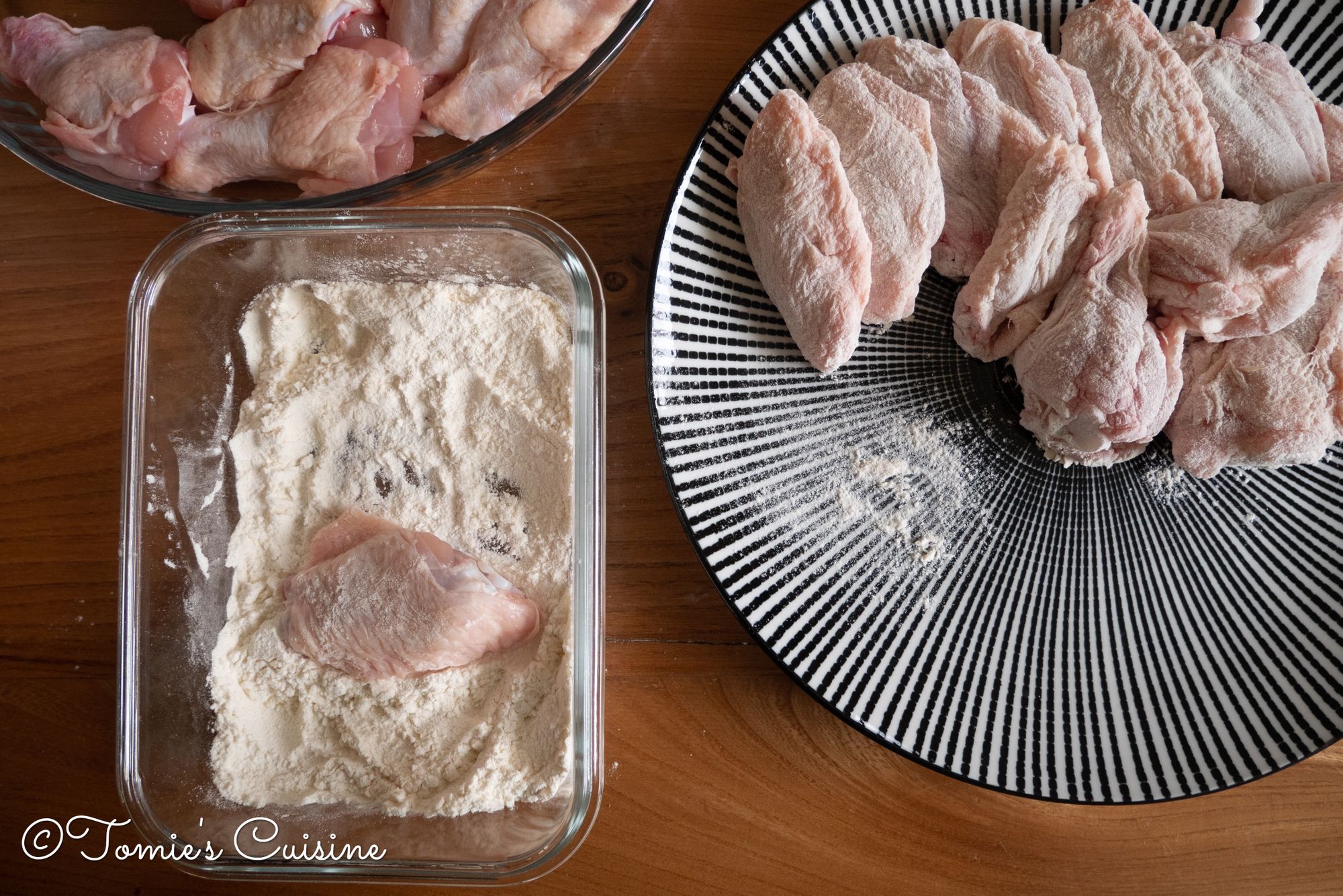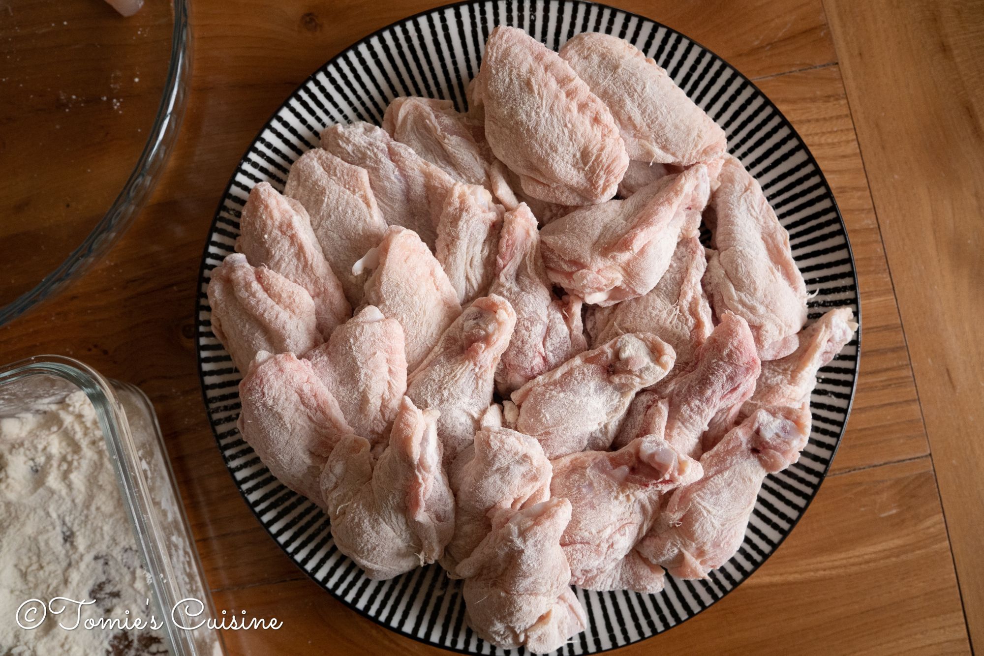 - Back to the chicken wings! Remove the excess water from the chicken wings and sprinkle some plain flour.