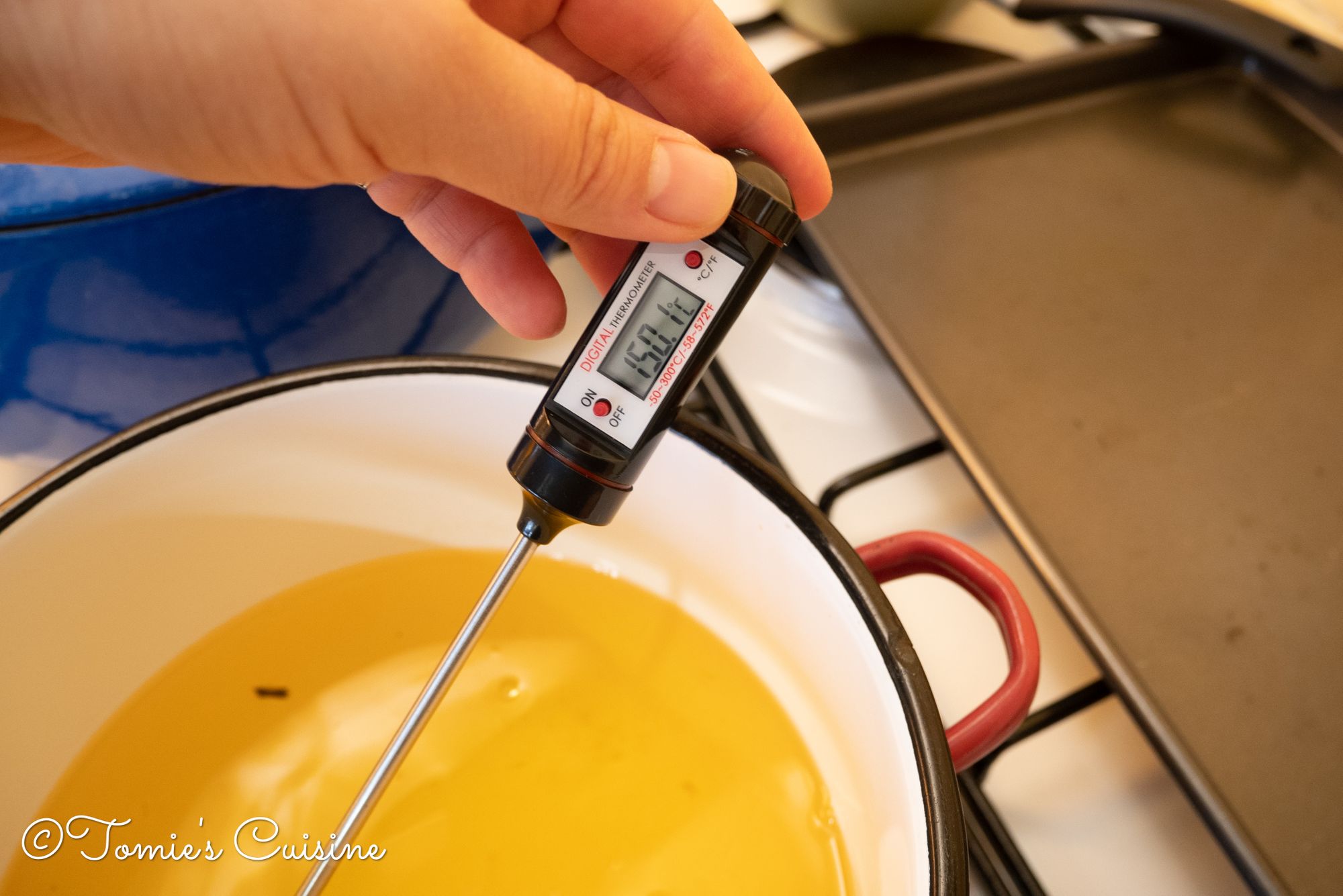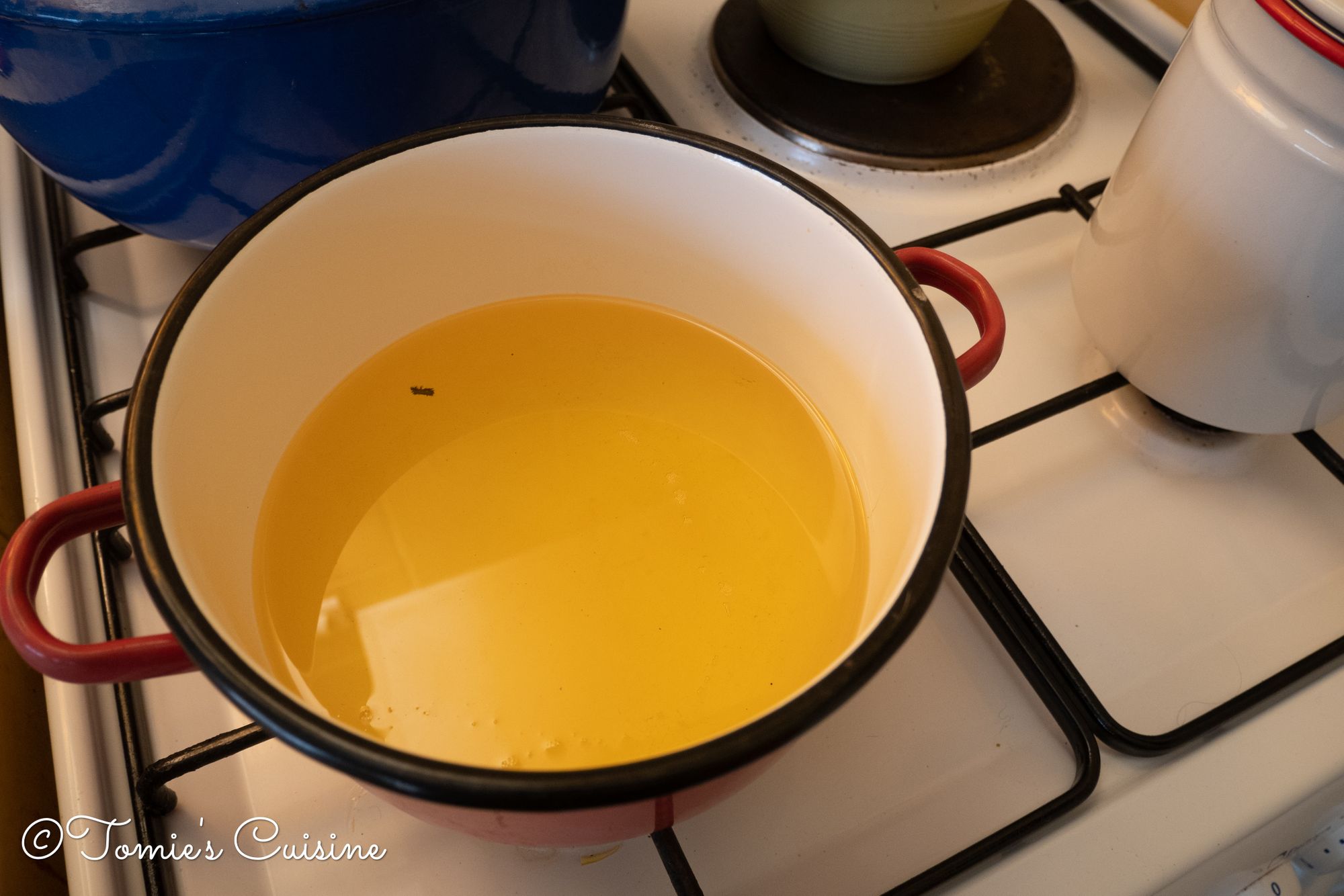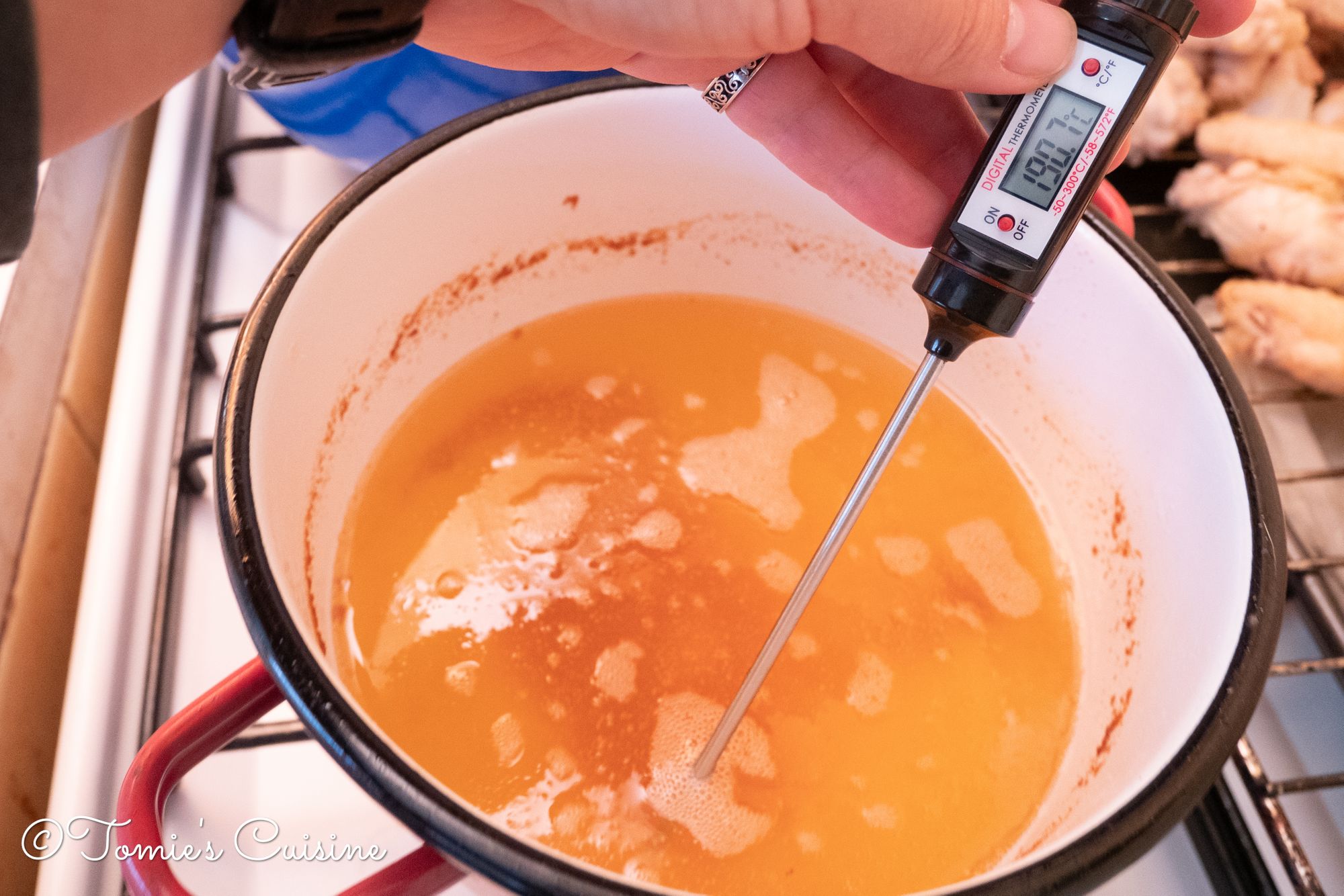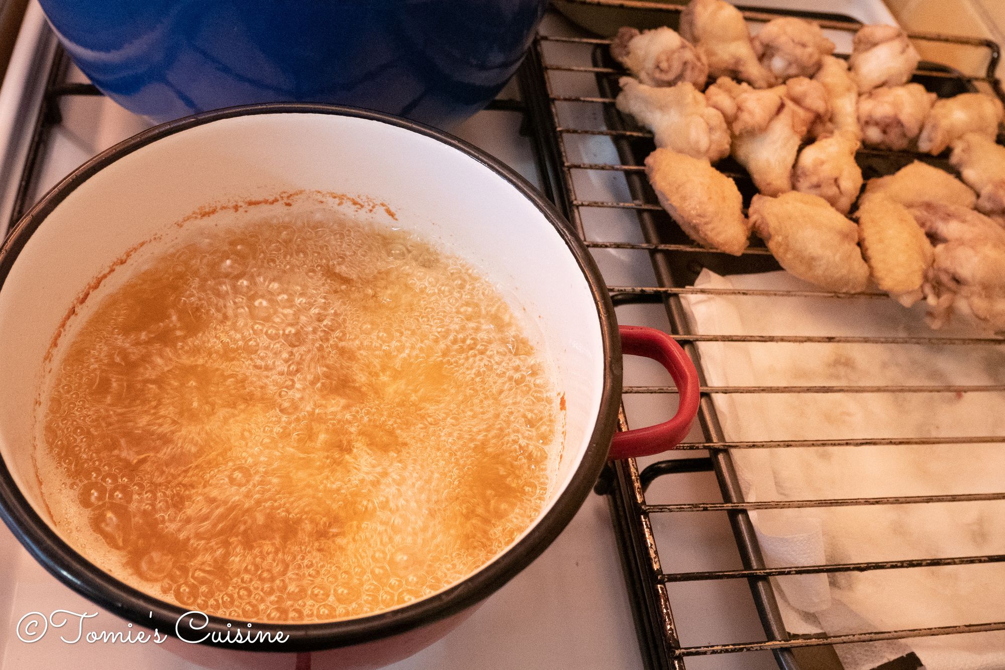 - Heat the vegetable oil to 150°C, and put the wings in it.