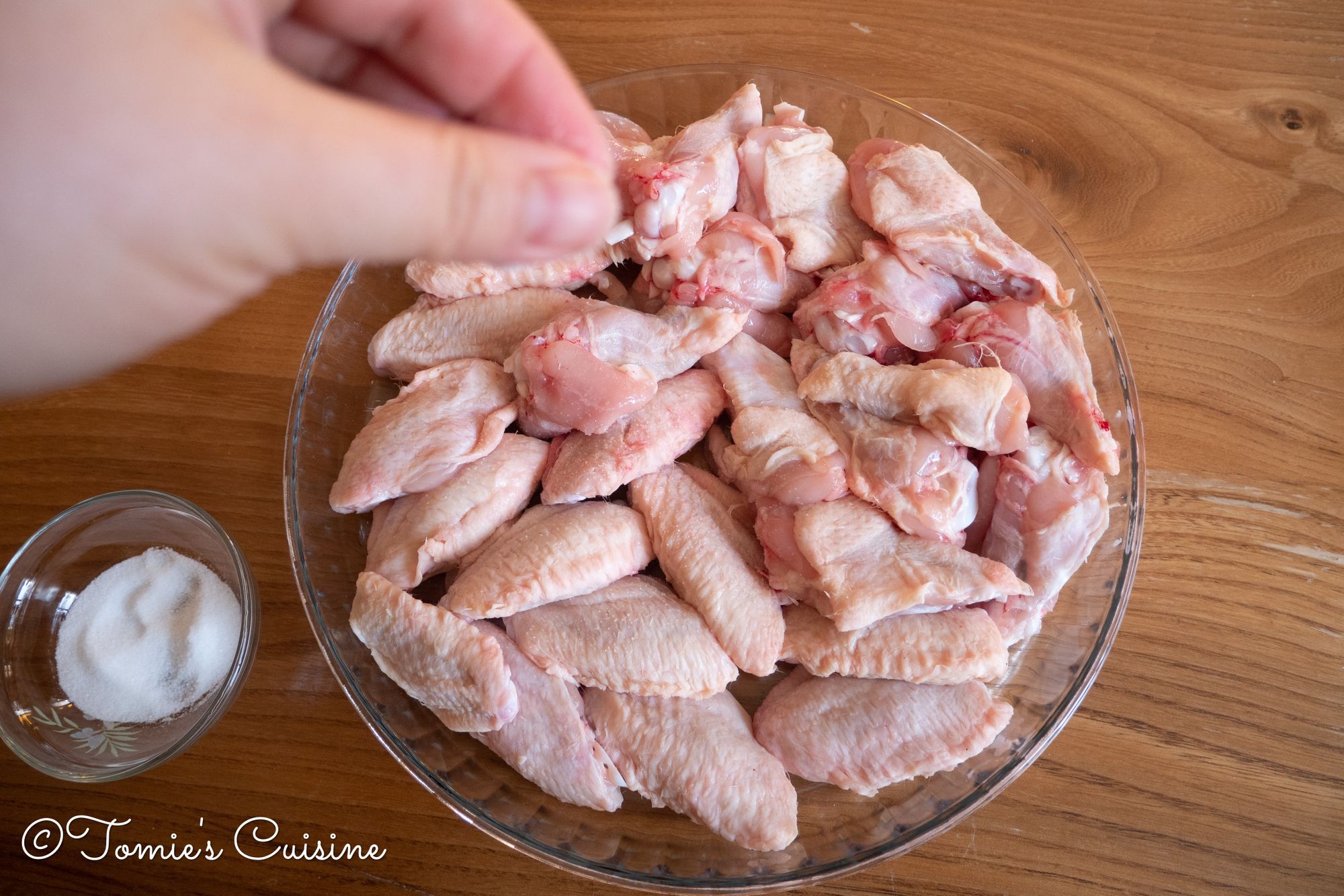 - Sprinkle a few pinches of salt and rub it into the chicken wings. Then leave it at room temperature for about 15 minutes. (make sure you cover the container if you have any cats!)