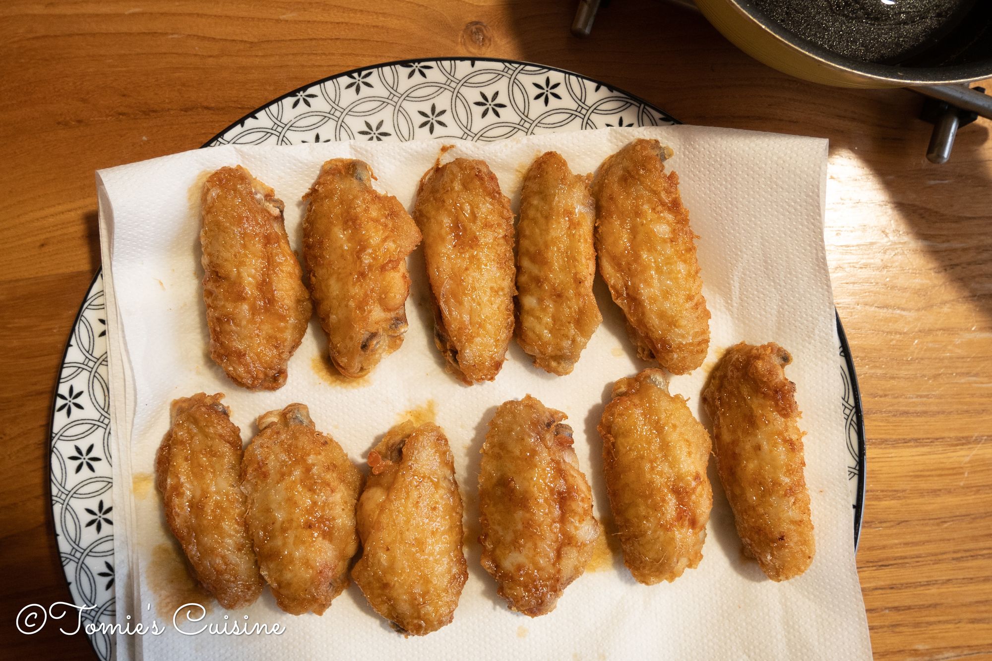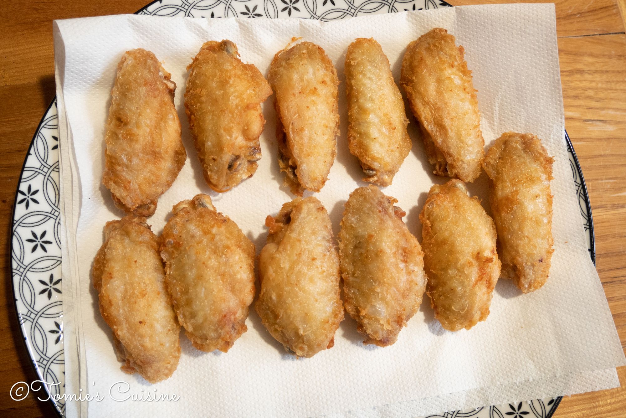 - Once you cooked all the wings, heat the oil to 190°C and put the chicken back and cook for 1 to 2 minutes. (⚠️ BE CAREFUL! ⚠️ Oil splashes. Wear an apron if you have one.)