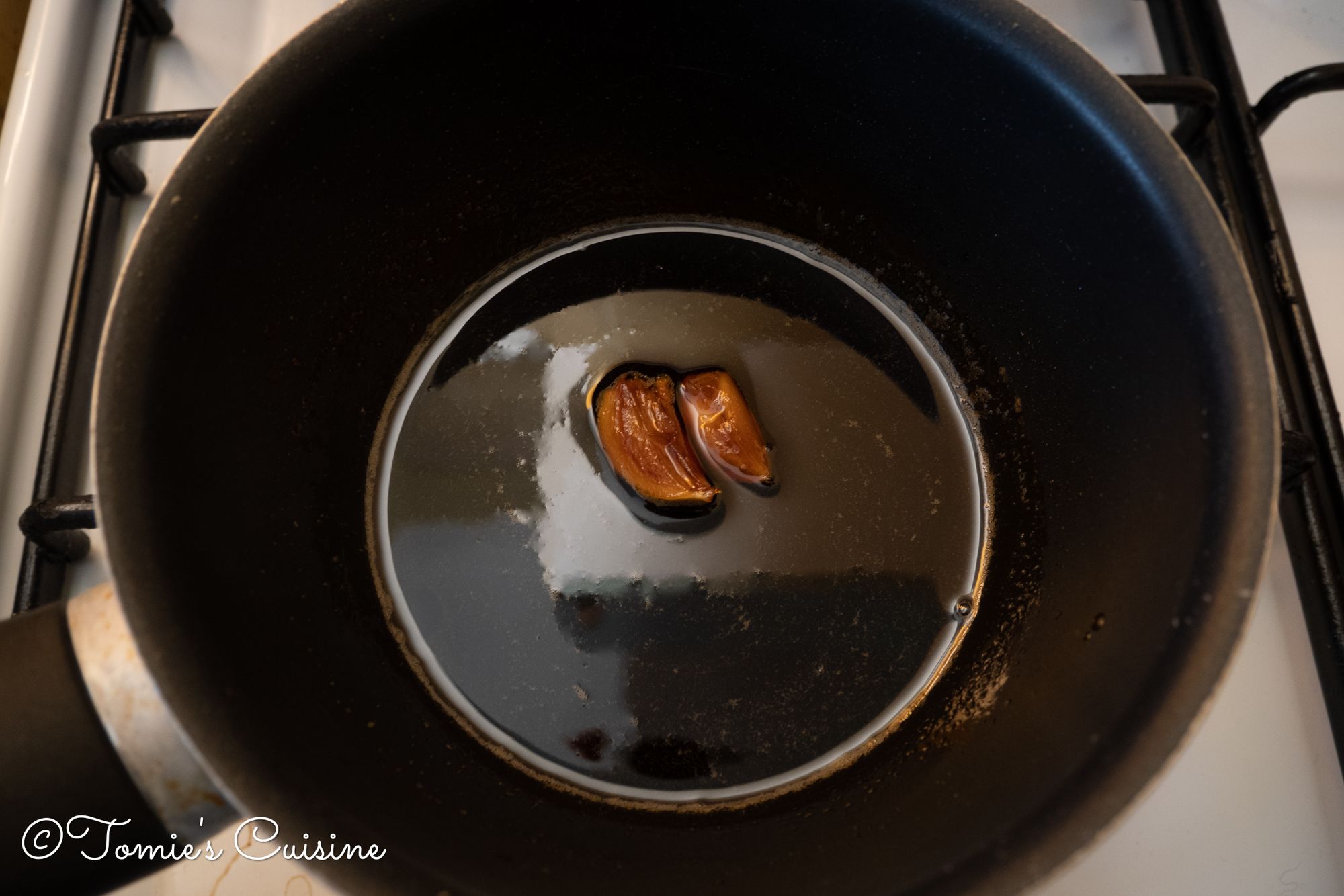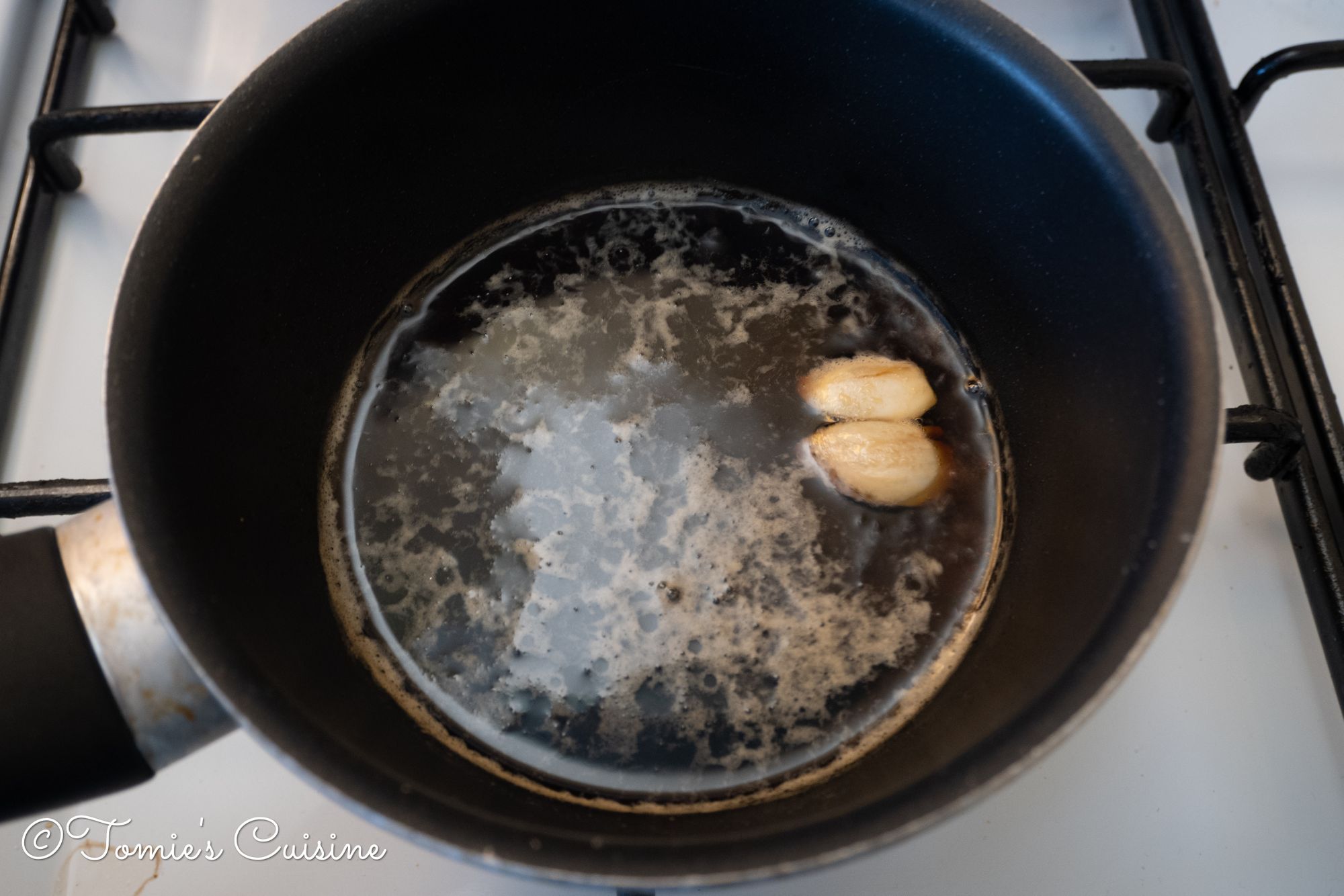 - While you are waiting for the next step for the chicken, you can make the sauce. Crush the garlic with your knife’s blade flat and add to a small saucepan with all the sauce ingredients.