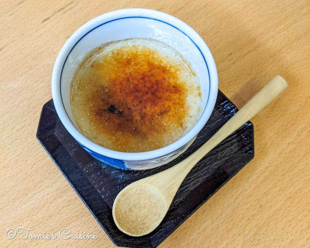 I made a creme brulee with the hojicha (roasted green tea) from Tsuen using my creme brulee recipe as a base. The only difference is that this time I infused hojicha when I warm cream and milk. The rest of the recipe is identical.