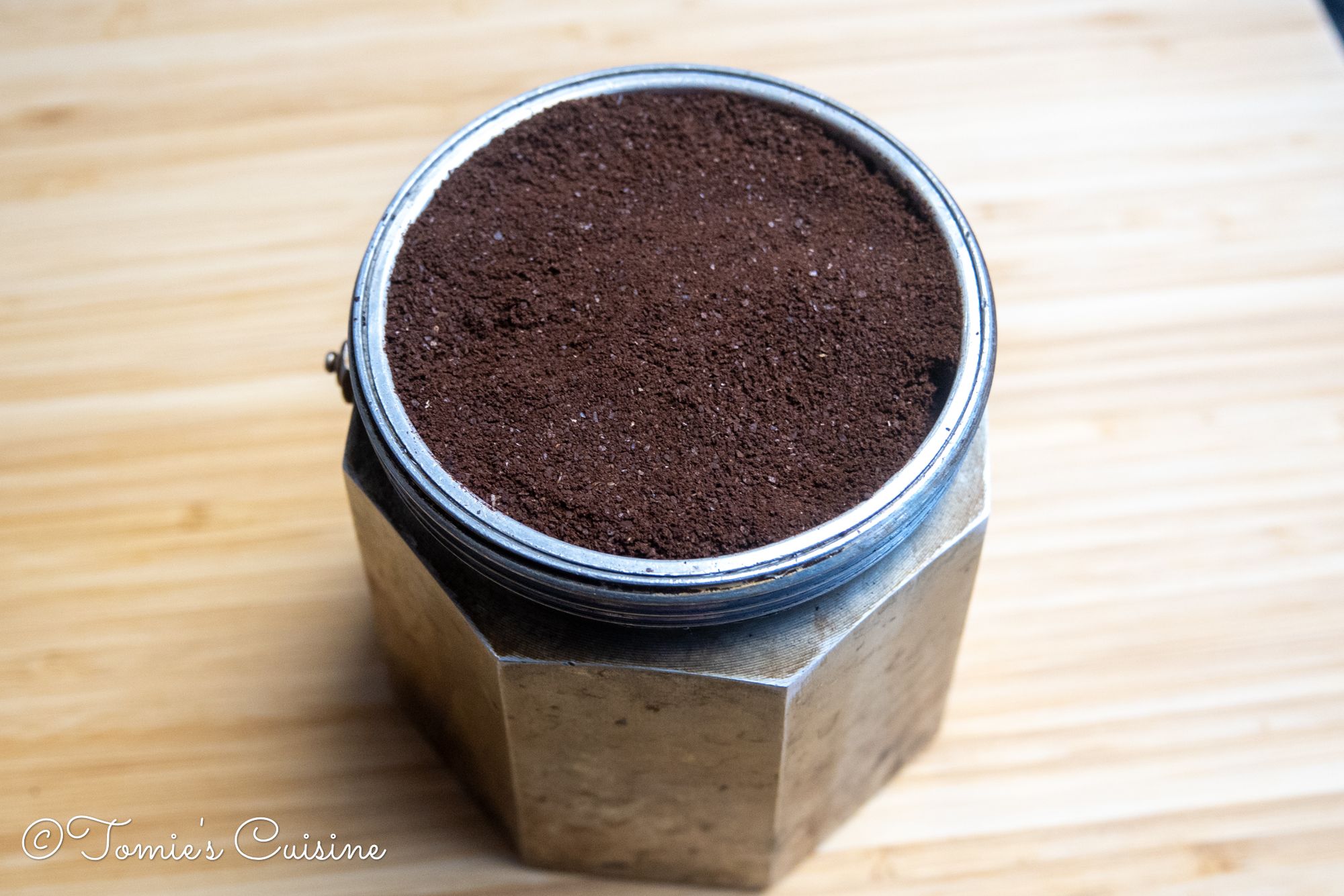 - Fill the filter funnel with the coffee ground without pressing down too much. Ensure no grains of coffee remain on the funnel's edge before closing it.